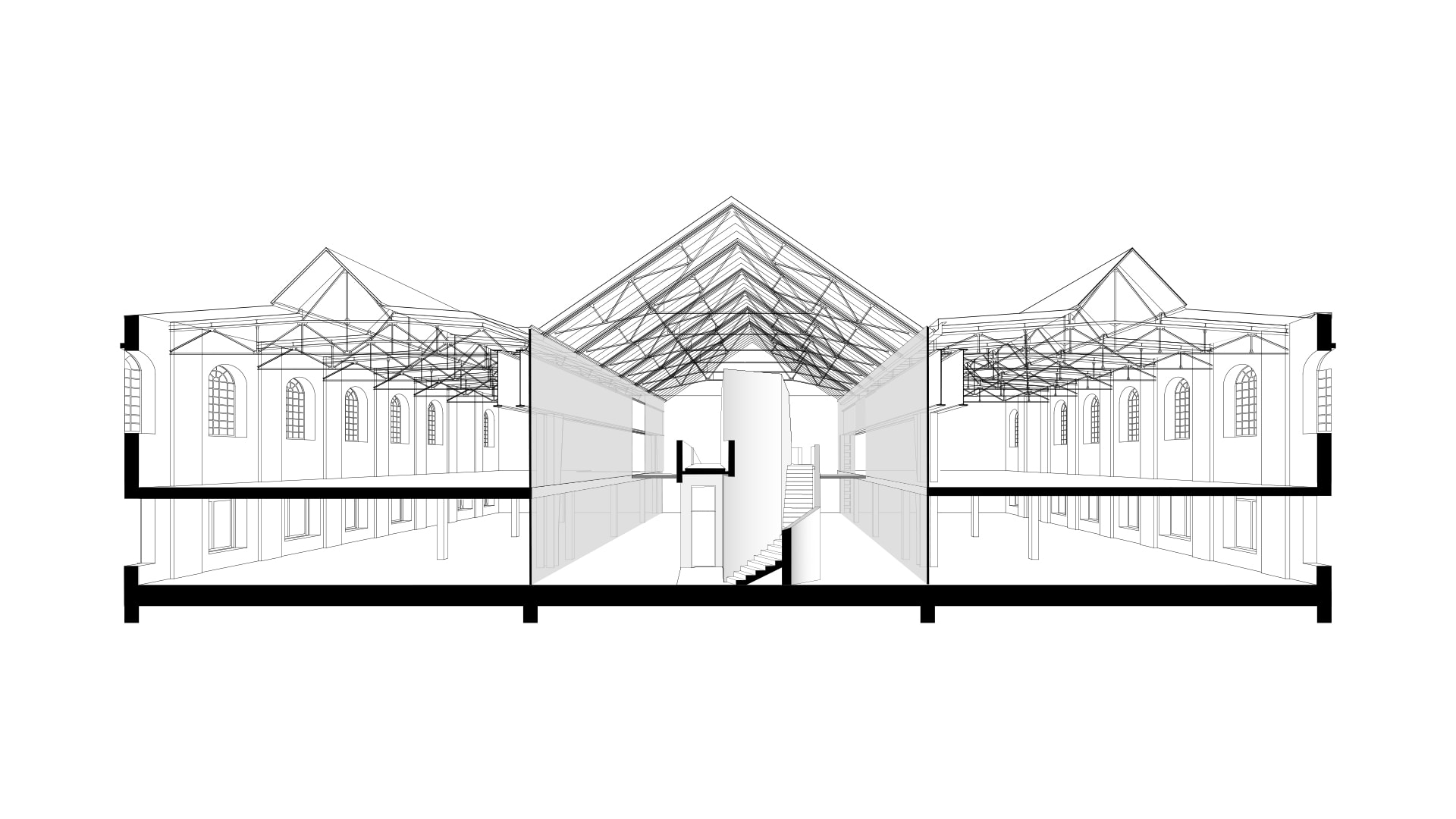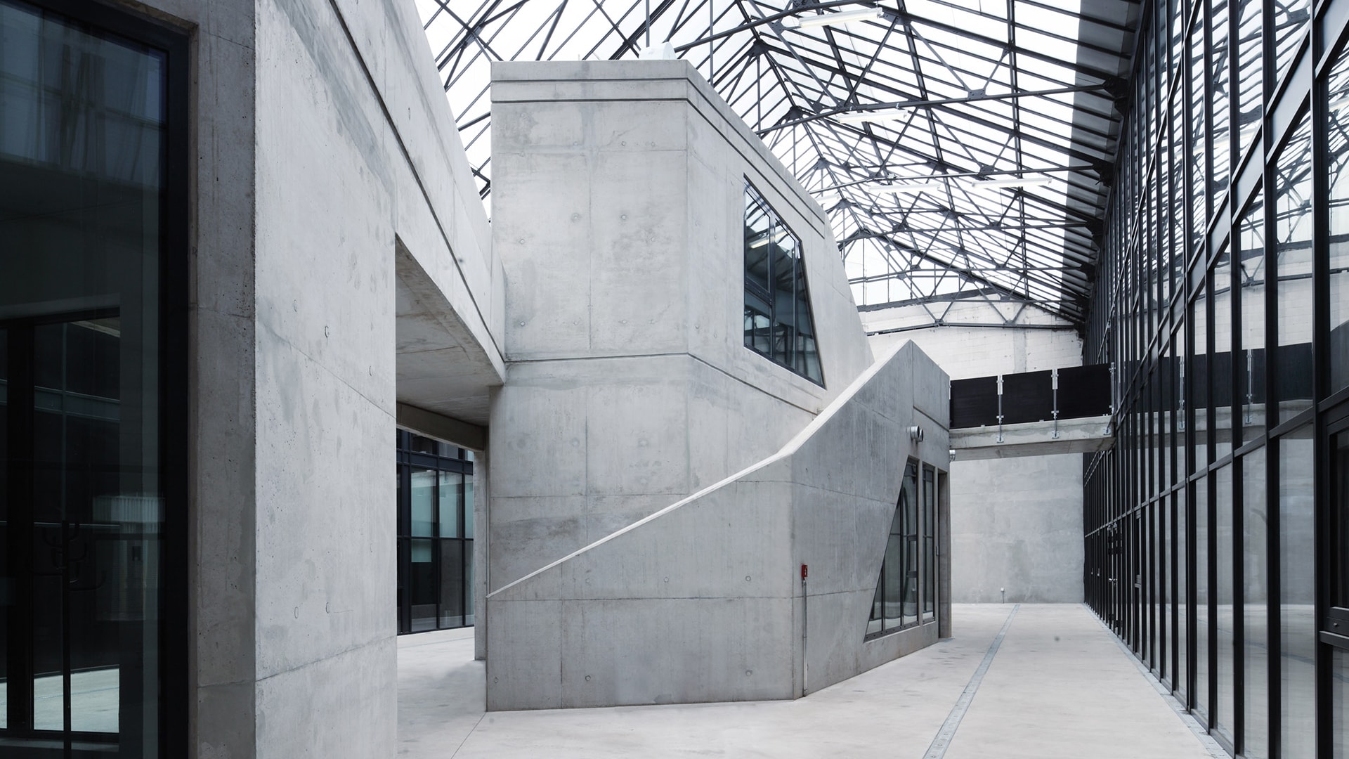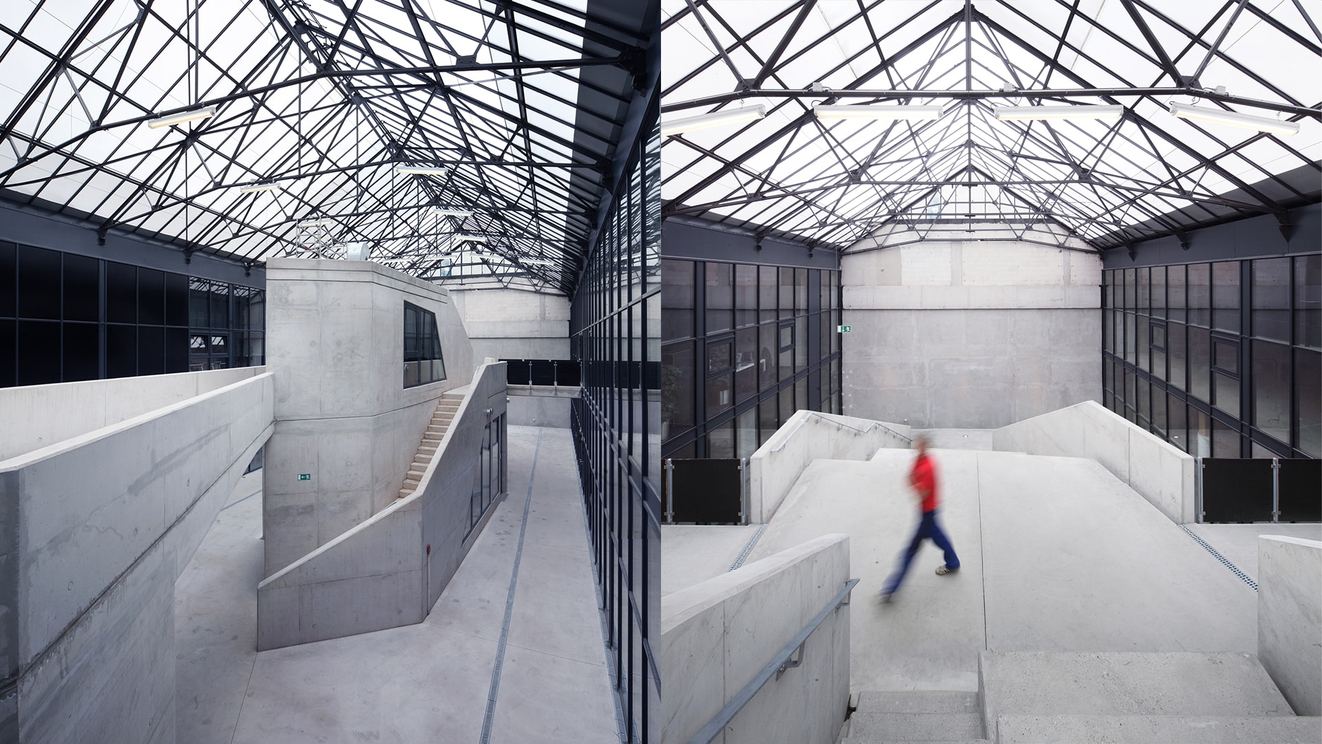 Die Planung für die Umnutzung haben wir ausgehend vom Gebäudebestand und den verschiedenen Nutzungsszenarien, die dieser geboten hat, entwickelt. So haben wir den Grundriss weitergedacht und in die äußeren Hallenschiffe eine zweite Geschossebene eingezogen. Die dort entstandenen Büroflächen lassen sich flexibel in verschieden große Einheiten aufteilen und sind vom Mittelschiff thermisch abgesondert. Die neu entstandene mittlere Halle haben wir durch eine skulpturale Betontreppe erschloßen. Durch die Öffnung der Dachfläche über der Halle ist zudem eine Art Innenhof entstanden, von dem aus die einzelnen Einheiten erschloßen werden. Die Raumskultpur aus Sichtbeton beherbgt zudem gemeinsam nutzbare Besprechungsräume und eine große Freitreppe lädt zu informellen Treffen ein.