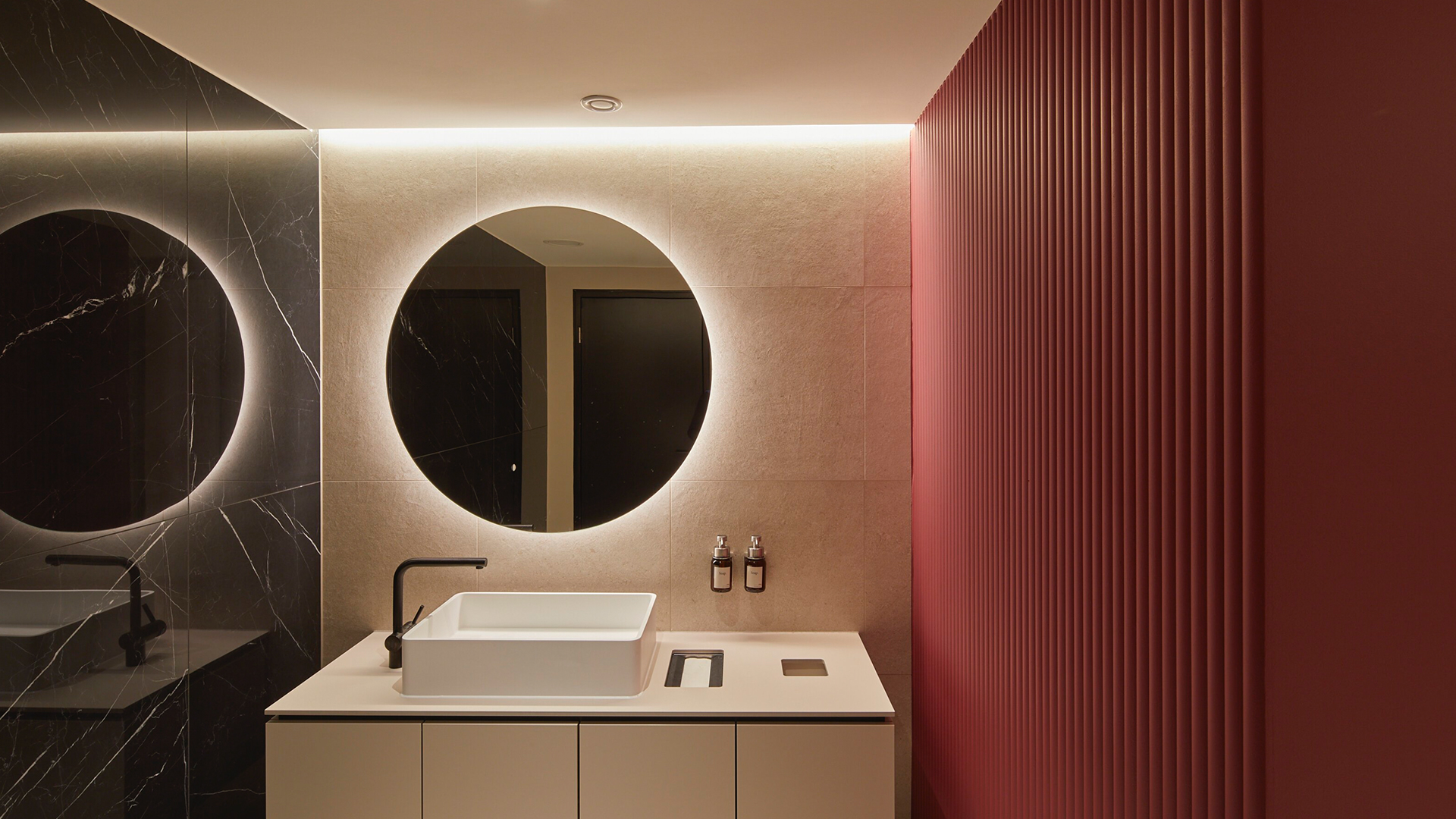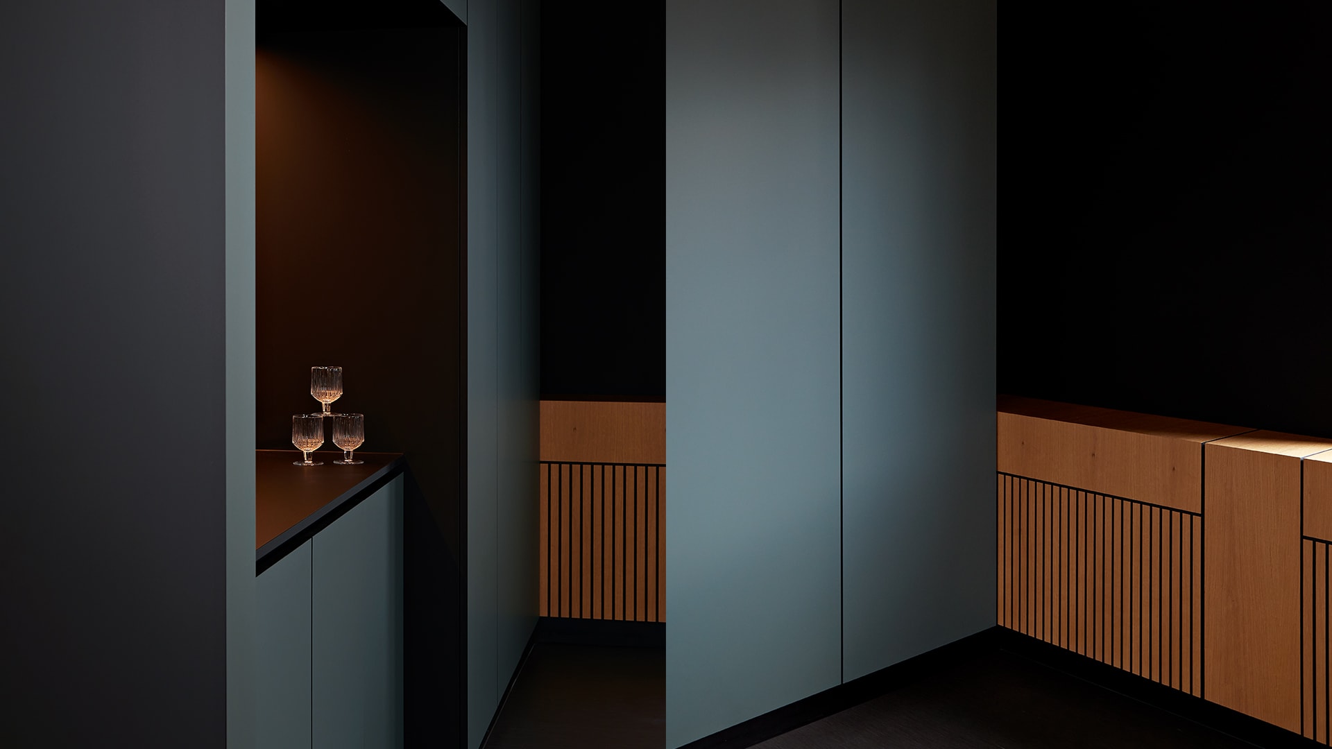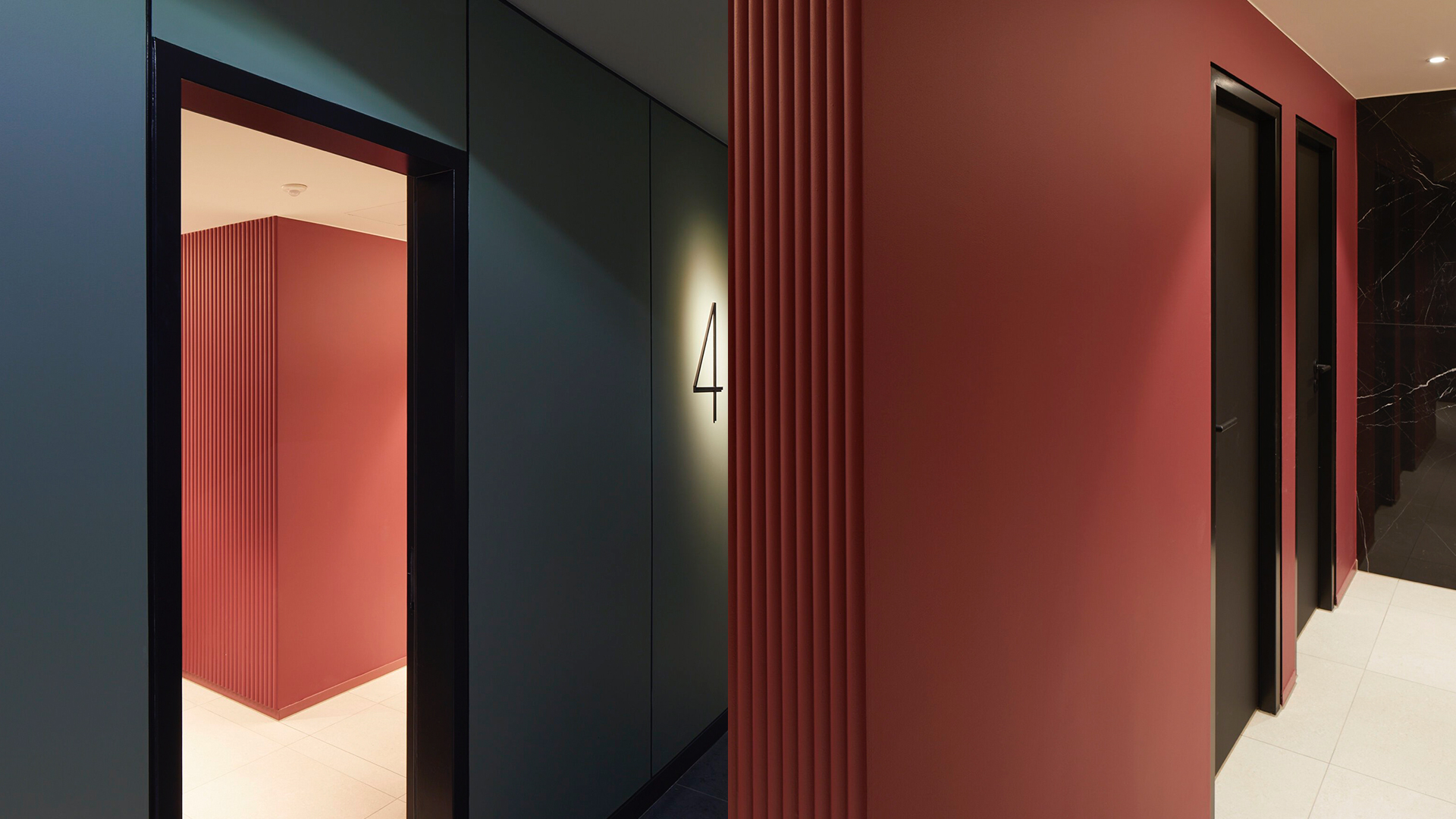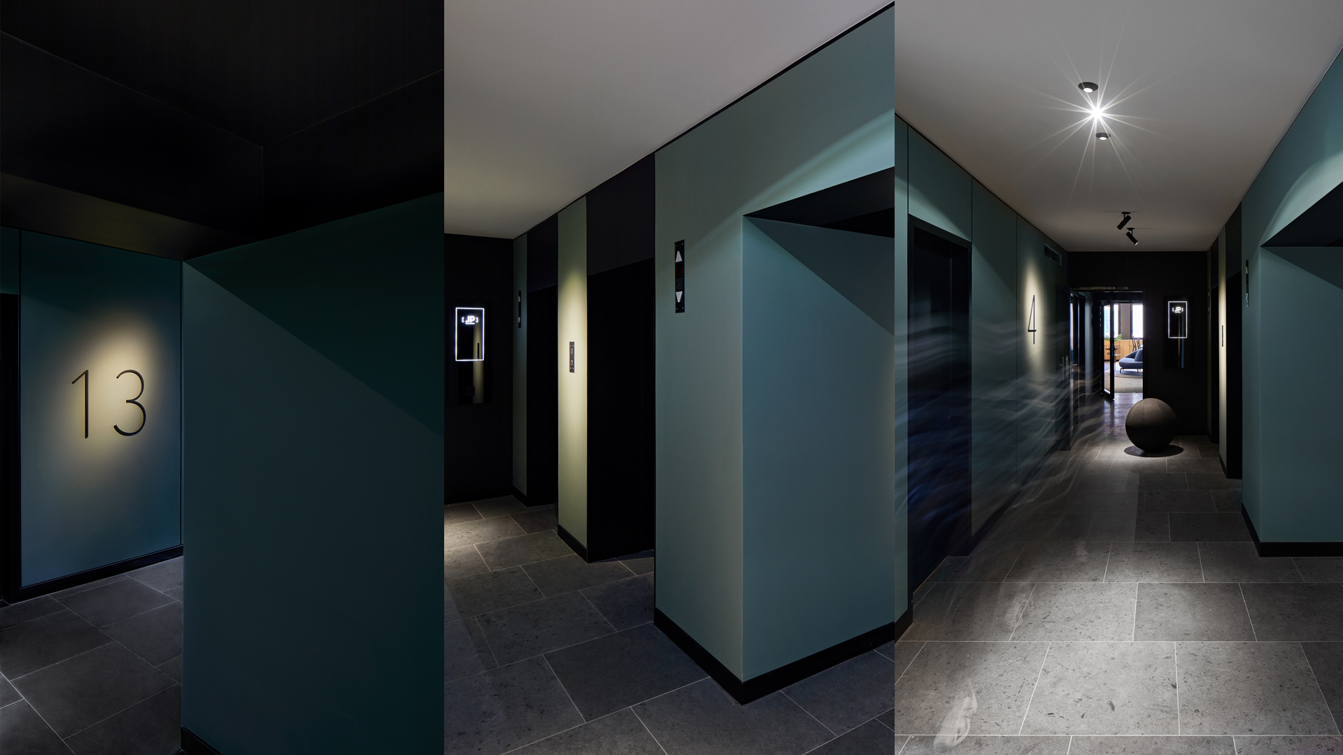 Die neue Visitenkarte des Gebäudes ist das neu konzipierte Foyer samt Vorplatz. Ein markantes, geschwungenes Vordach aus schwarzem Metall setzt den Eingang klar von der Straße ab und lädt zum Reinkommen ein. Naturstein und Holzvertäfelungen strukturieren das Foyer und knüpfen an die Materialität der 60er Jahre an und deren mondäne Eleganz.
