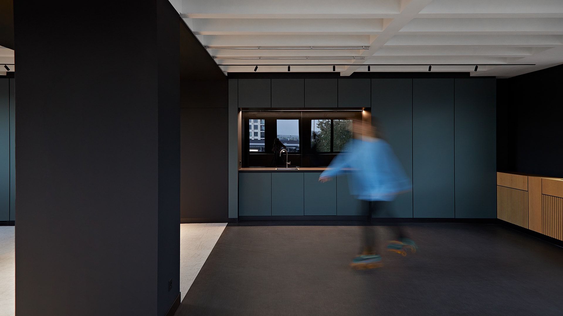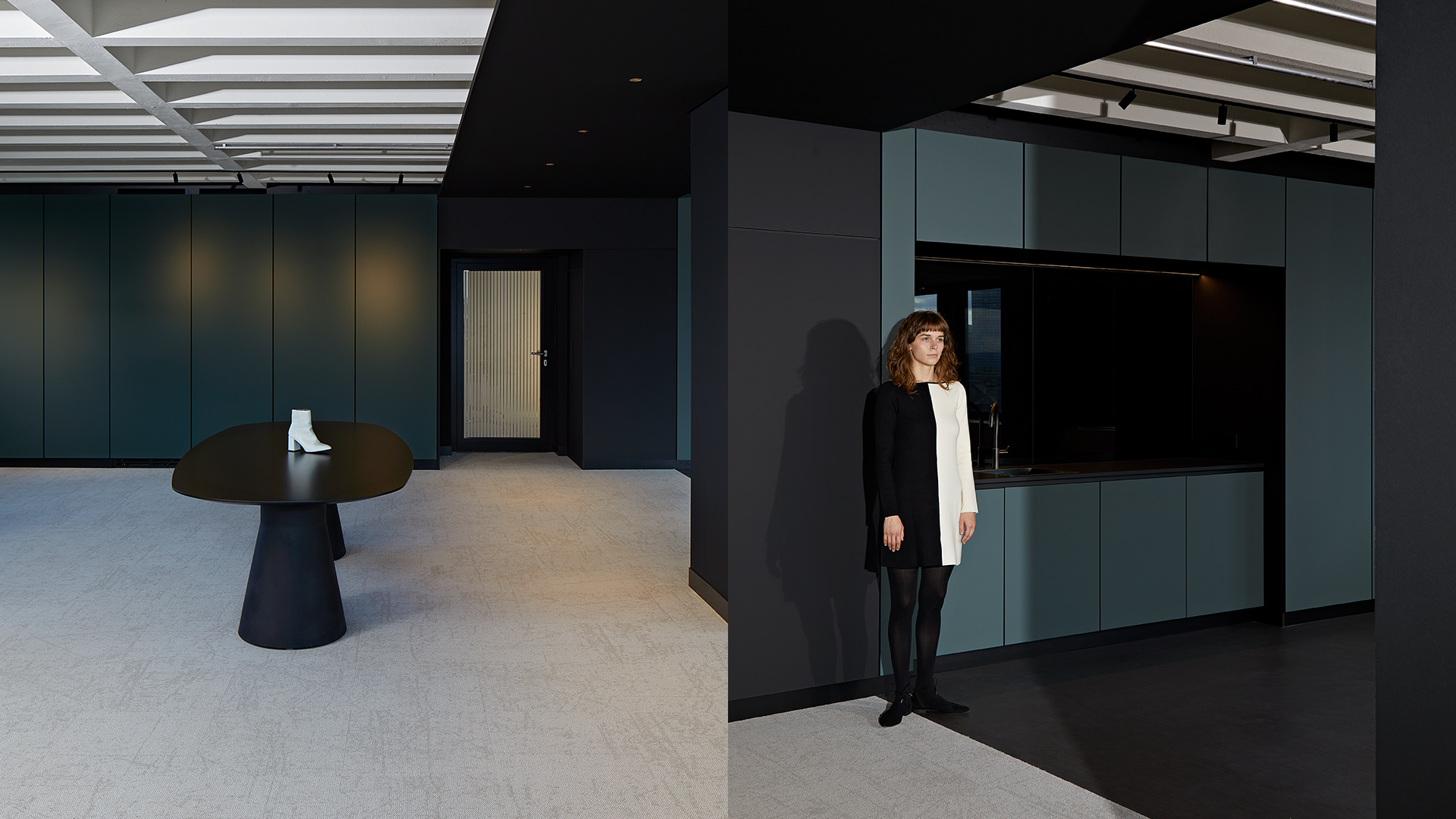 Die Büroetagen mit ihren abgehängten Brandschutz-Decken, die teilweise unterhalb der heute noch zulässigen Ausbauhöhe lagen, wurden durch die Sichtbarmachung der Betonstruktur der Kassettendecke und einem minimalauftragenden Brandschutzputz auf eine Raumhöhe von bis zu 2,85 m angehoben. Der Look der Stahlbetonkassettendecke mit seiner eigenen, eher rauen Optik prägt die Räume nun maßgeblich und erzeugt ein einzigartiges Loft-Feeling in den Flächen.