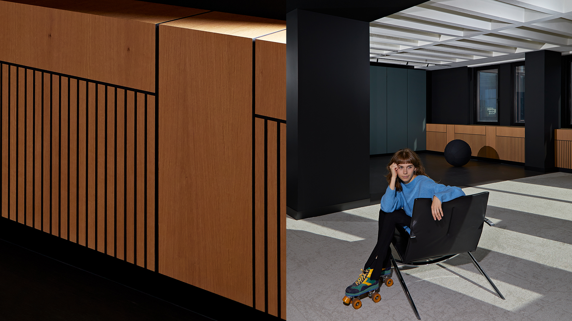 Als Kontrast zu den rauen Betondecken wurden die Fassadenbrüstungen mit der integrierten Lüftungstechnik mit furnierten Echtholz-Vertäfelungen verkleidet, die mit Ihrer filigran gegliederten Lamellenstruktur und natürlicher Eichenholzoptik den Raum veredeln und an die Ausbauzeiten aus dem Baujahr des Hauses anknüpft.
