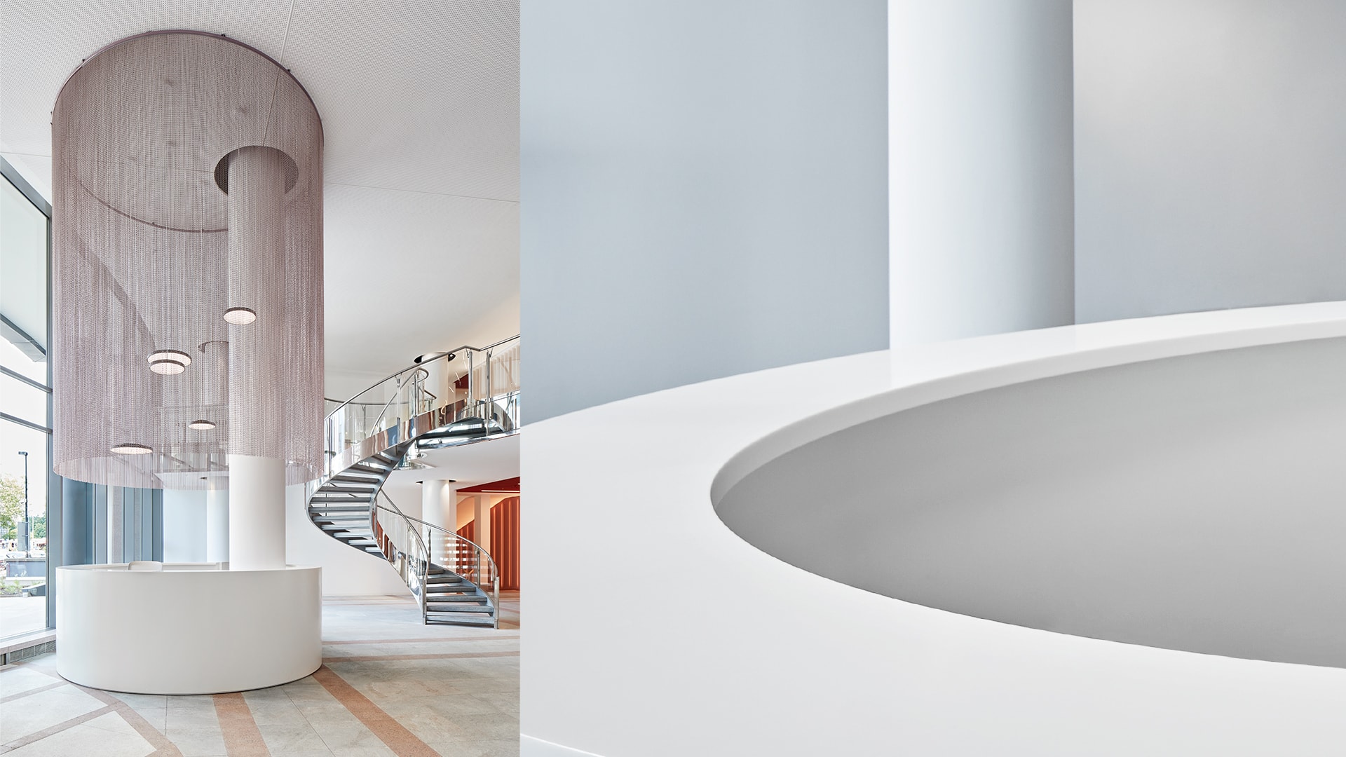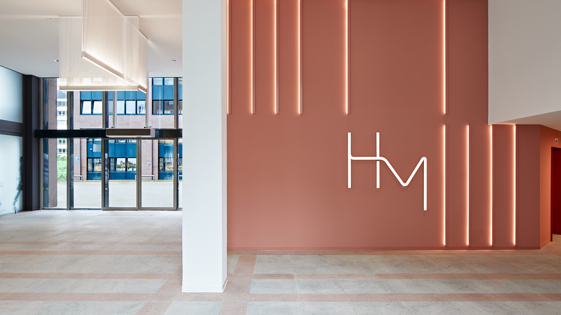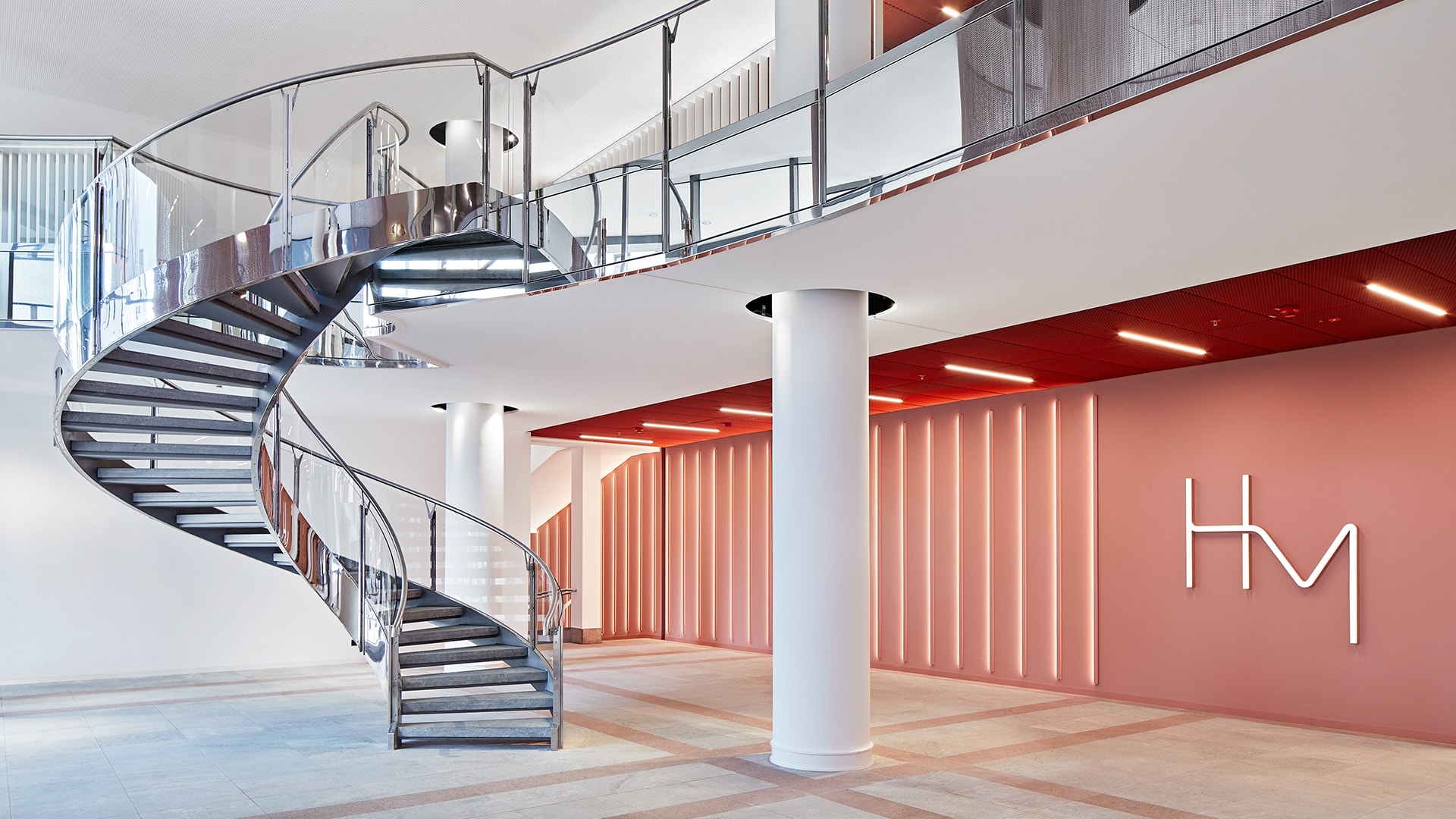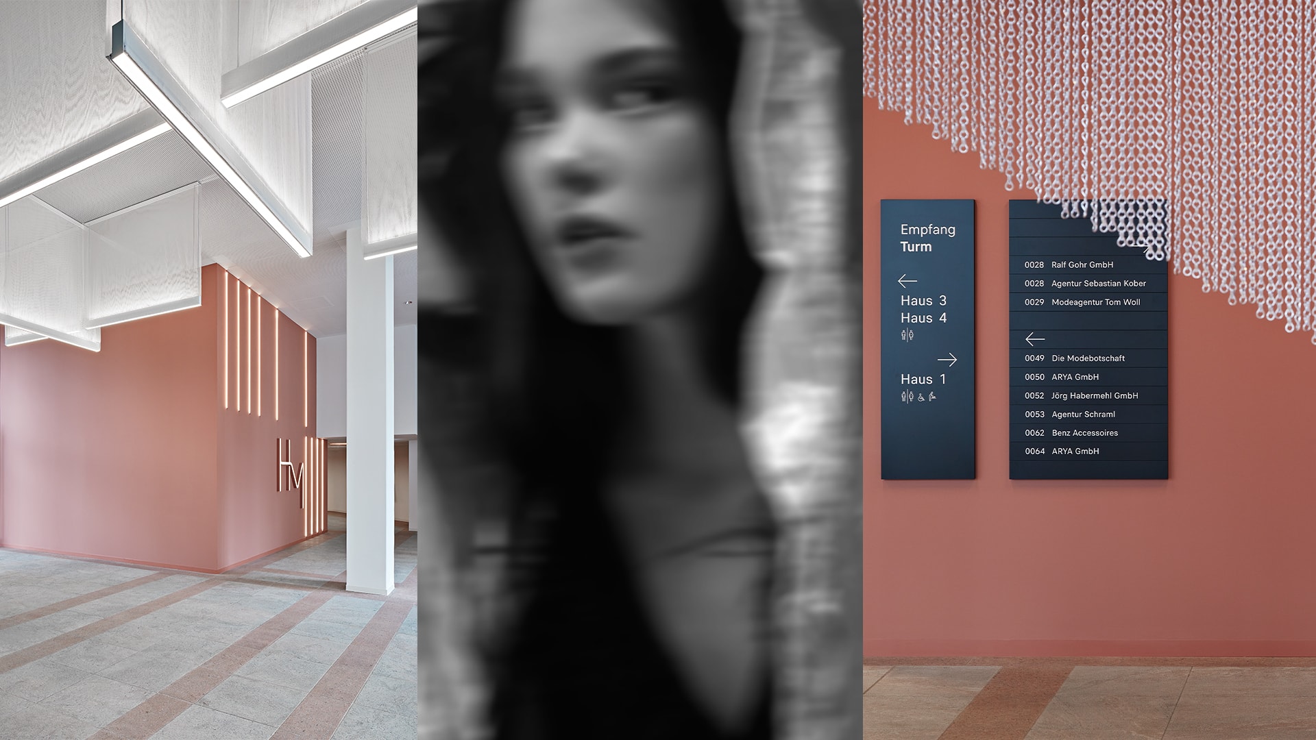 Ein stereotypes Bürogebäude aus rotem Granit aus den 80er Jahren. So wenig fashionable. Dies gibt uns den Impuls zur Idee eines rosaroten Dress Up - ein Bekenntnis zu Farbe, Textur, Licht. Wir rücken das Gebäude zurück ins Rampenlicht und schaffen das mit einem smartem Gestaltungskonzept im Bestand. Ein geschwungener Catwalk, der ins Innere des Foyers leitet – als Hommage an die Mode. Elegant gewobene Kettenvorhänge aus Aluminiummaschen – als Anlehnung an das Textile, Fließende. Lichtführung und Formgebung aus Linien und Kreisen – für mehr Dynamik und Rhythmus. Und abrundend ein neues Corporate Design samt Logo, Keyvisuals und Signaletik, entwickelt mit dem Designbüro unit-design – für ein aufeinander abgestimmtes Erscheinungsbild.