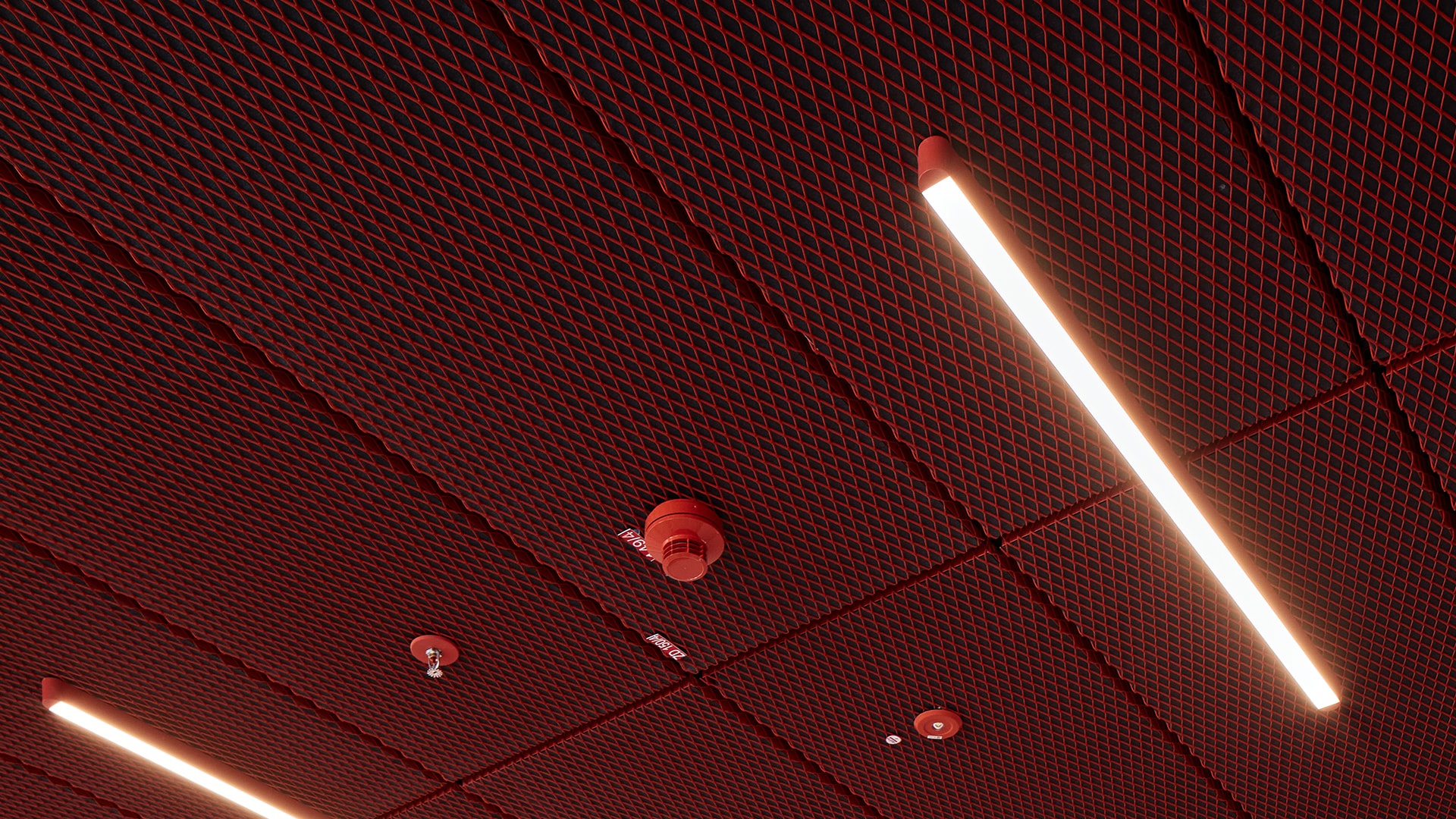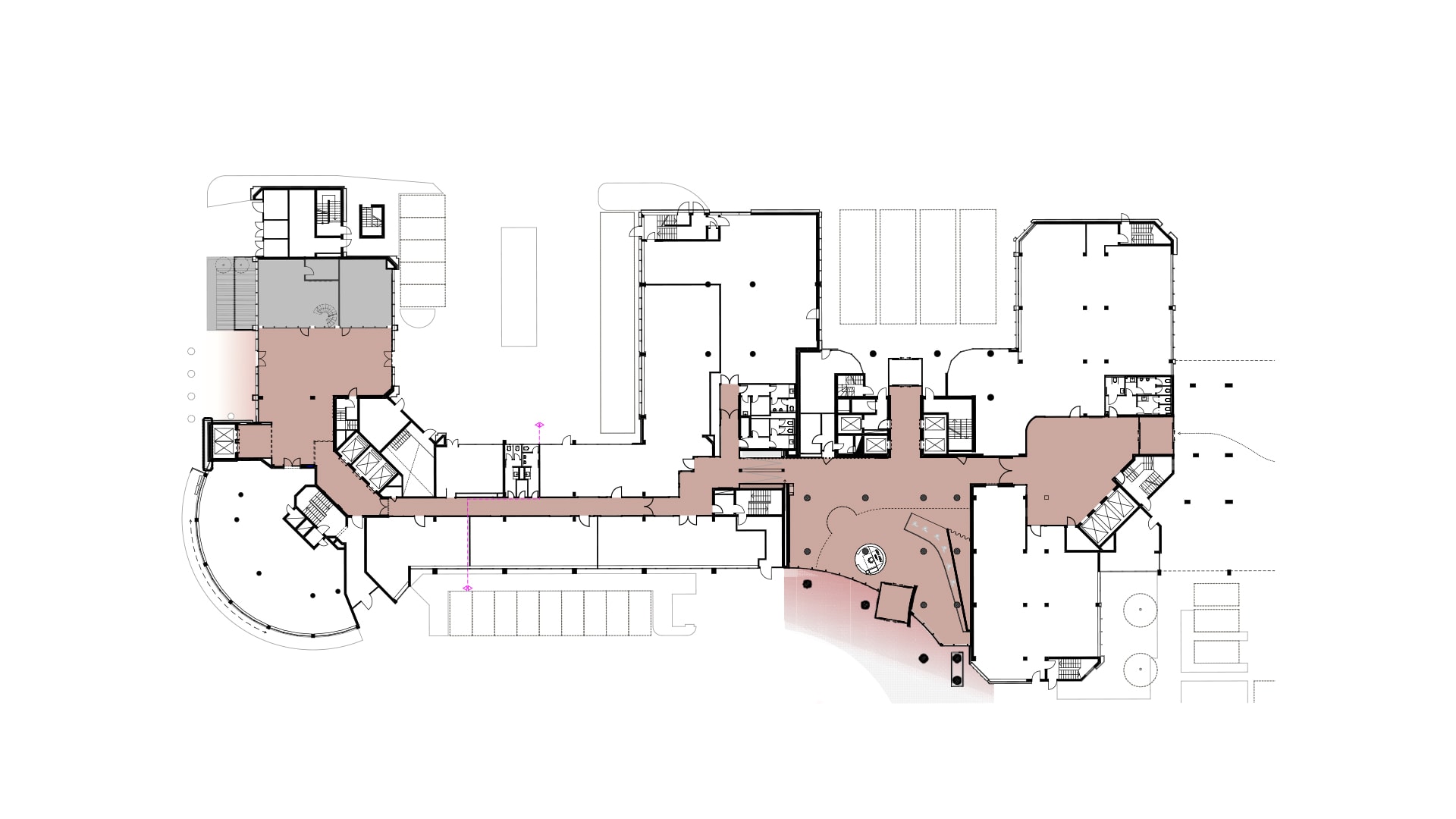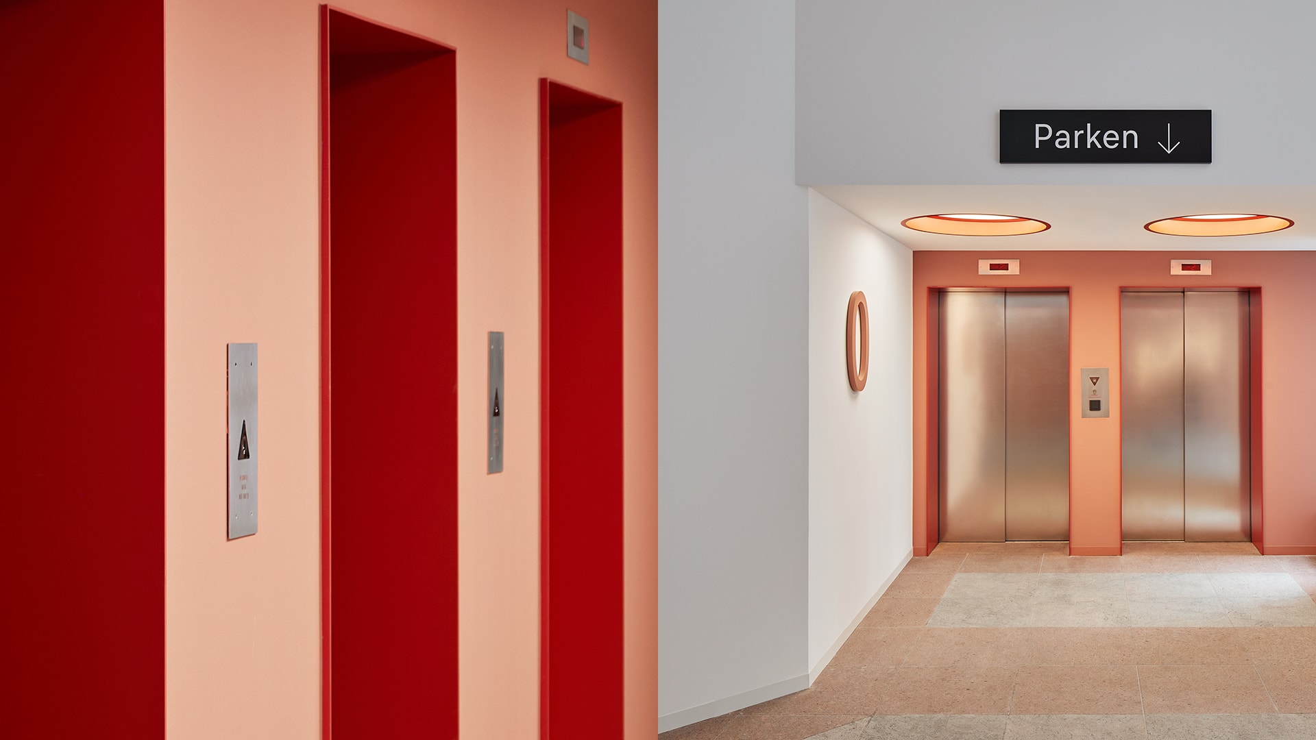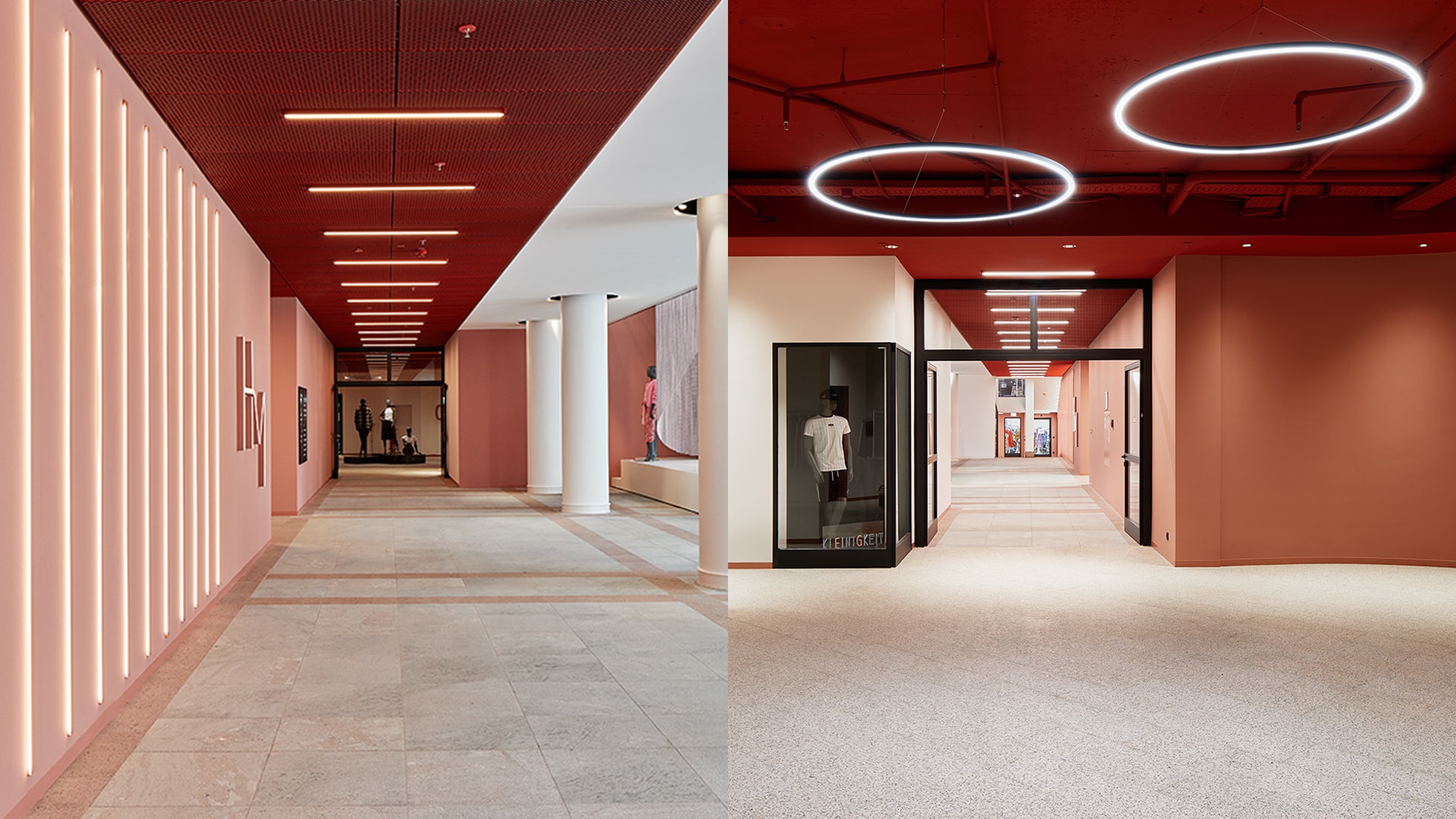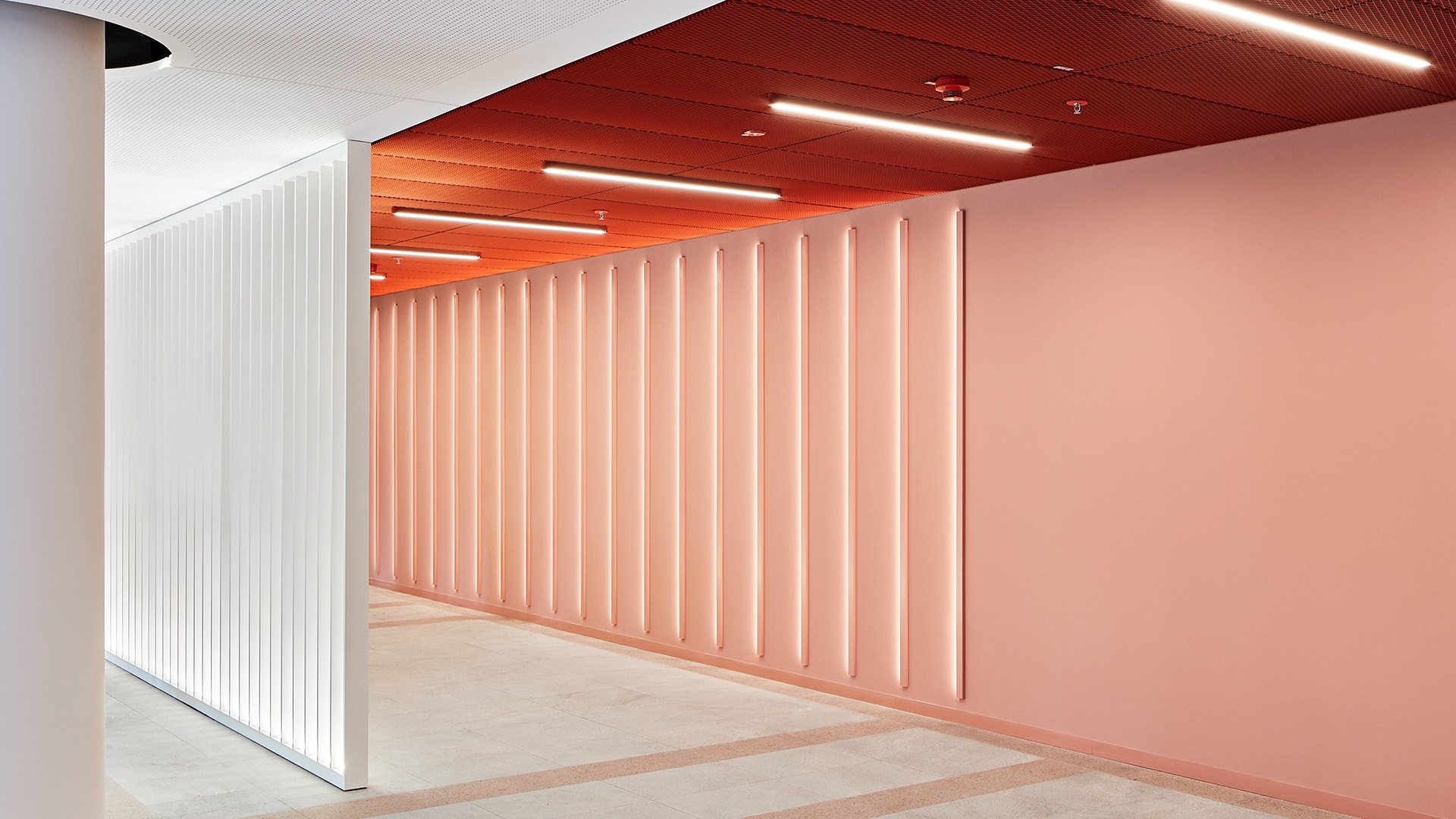 Der glänzende Bestandsboden wurde gestockt, um ihn so vollständig erhalten zu können. Der dadurch entstandene Rosé-Ton in matt fügt sich nun stimmig ins Gesamtkonzept ein und die neu geschaffenen Innenräume harmonieren mit der bestehenden Außenfassade. Wandverkleidungen, Streckmetalldecken, Sprinklerrosetten, Leuchtkörper, Sitzmöbel - alles wurde rosarot eingefärbt. Die monochrome Farbigkeit wirkt dabei präsent und doch hintergründig zurückhaltend.