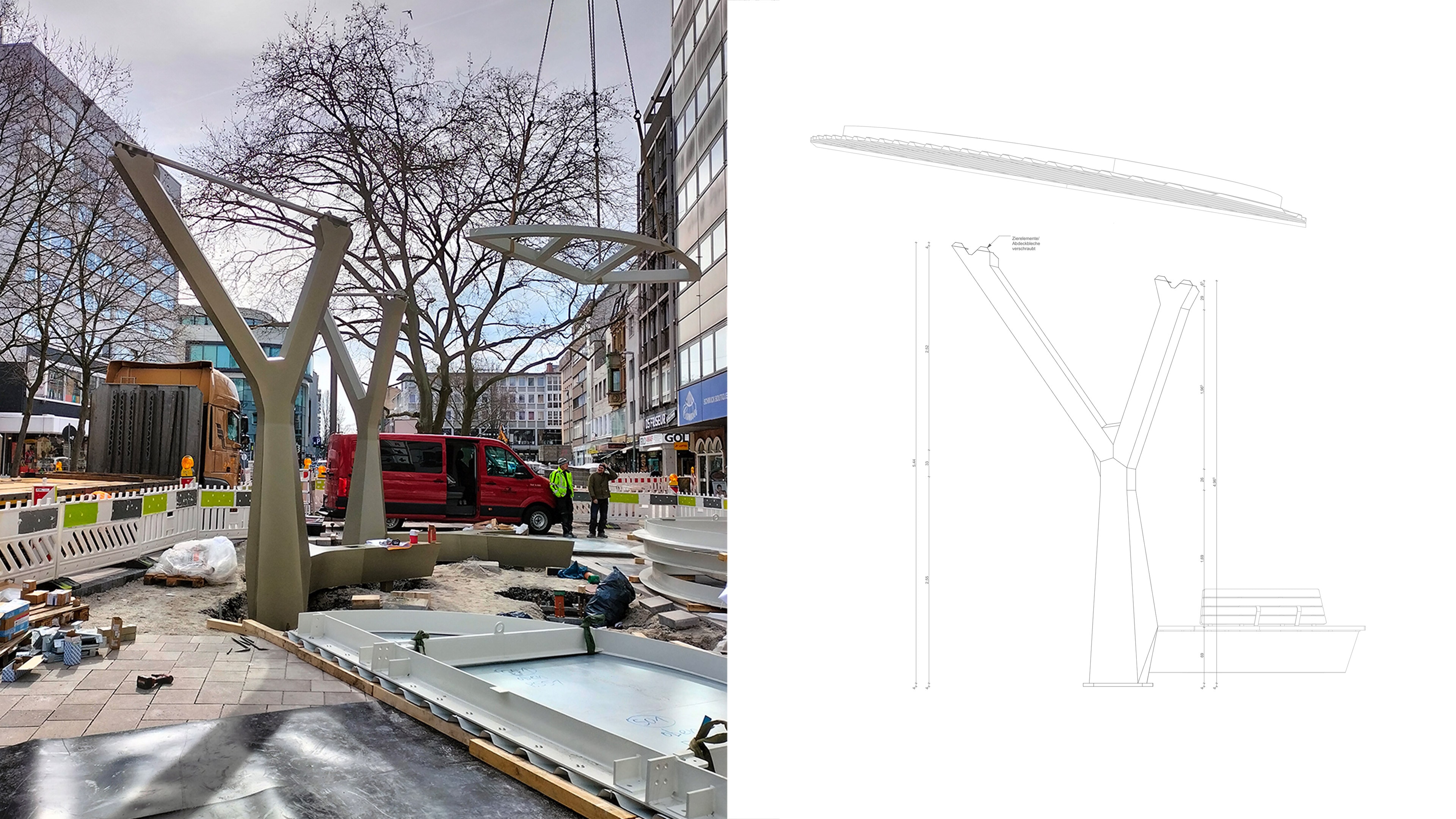 Unser Konzept basierte auf einer offenen und nicht gerichteten Form, die den Sitzbereich unter dem Dach in alle Richtungen öffnet und die Menschen dazu einlädt, im städtischen Raum zu verweilen. Das dreiteilige begrünte Blätterdach entwickelt sich organisch aus den angrenzenden Platanen und verlängert die Kante zur Busspur auf harmonische Weise, ohne den Raum optisch zu unterteilen. Das Dach besteht aus einfachen Trapezblechen, die mit einer Extensivbegrünung versehen sind, während der Stamm eine robuste Stahlkonstruktion bildet. Die Sitzbank aus verzinktem Stahl mit massiver Holzauflage fügt sich nahtlos in das pulsierende Zentrum des Offenbacher Marktplatzes ein.