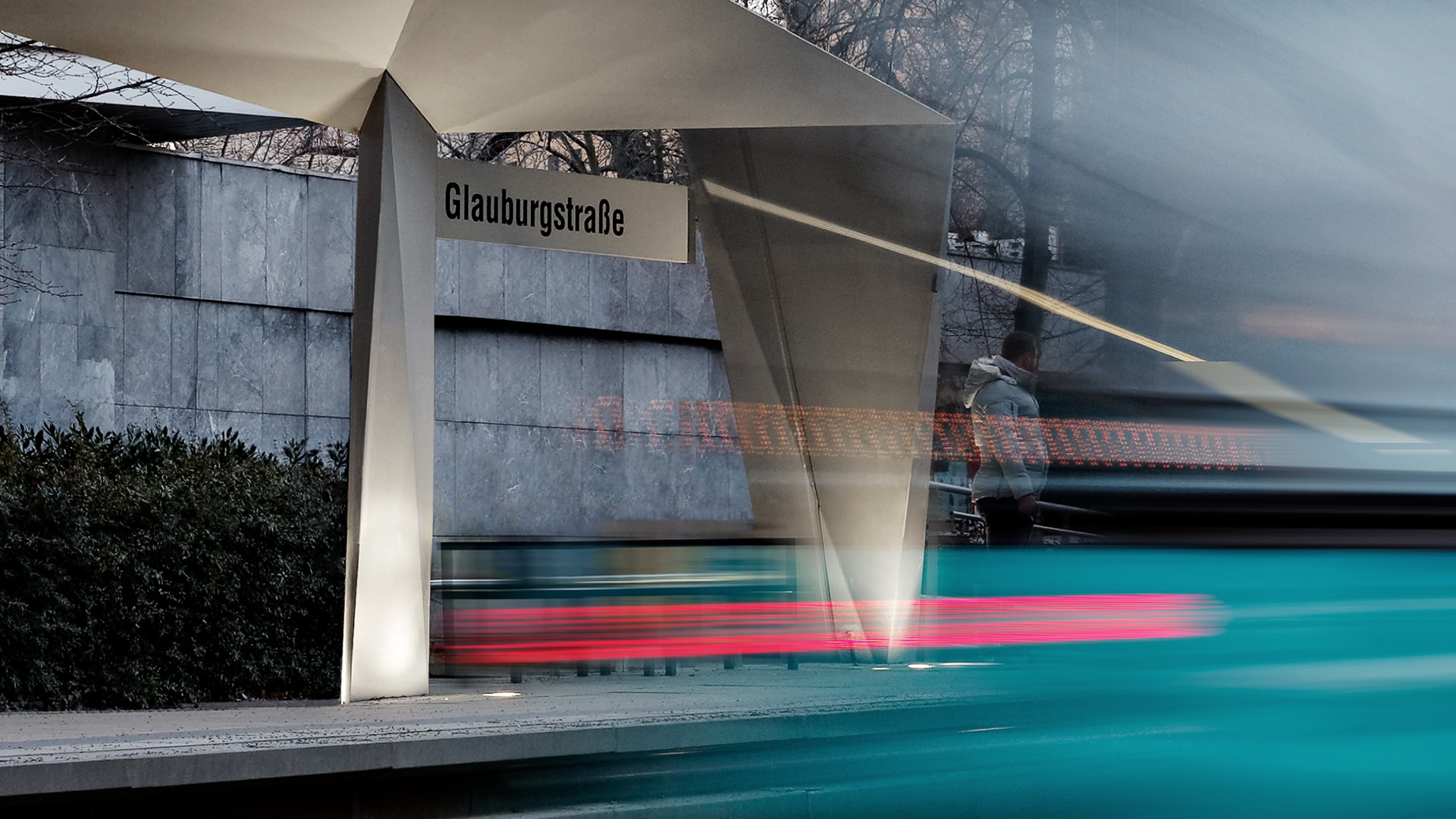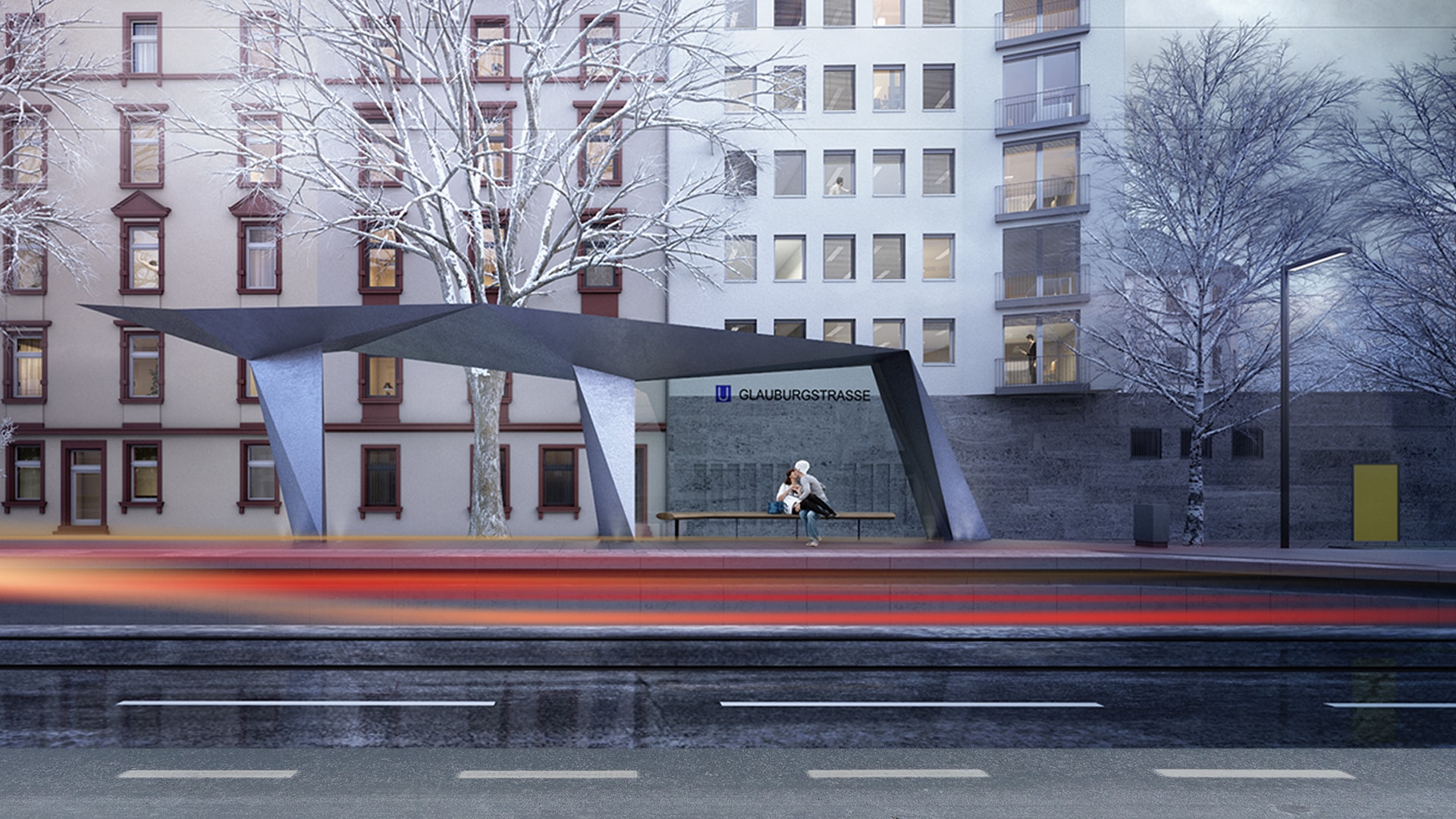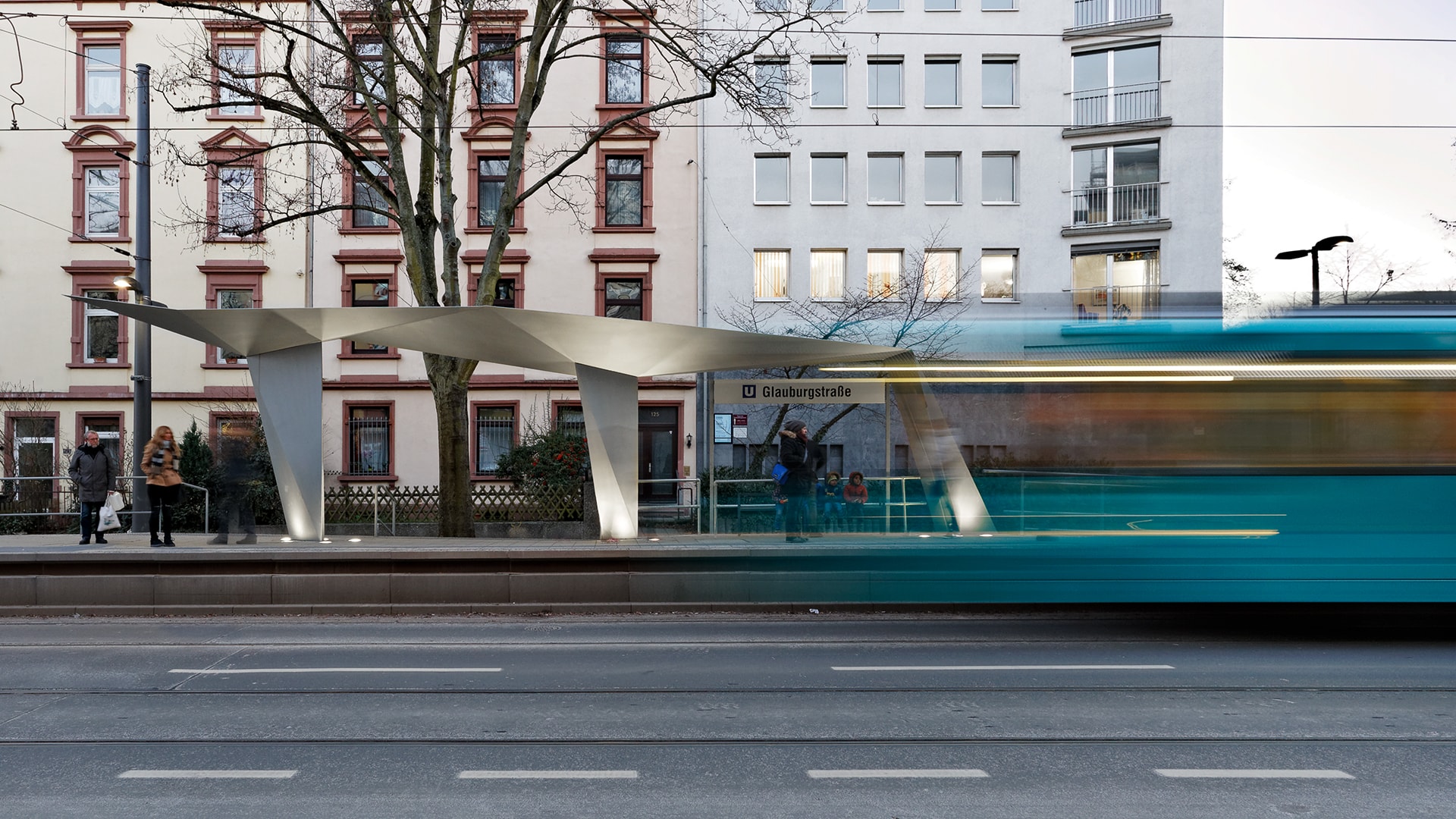 Wir falten den städtischen Boden auf und modellieren ihn zu einer Haltestelle. Es entstehen Rampen, Plateaus, breite Sitzstufen. Unser gewinnender Entwurf für den von der Verkehrsgesellschaft Frankfurt am Main ausgelobten Realisierungswettbewerb definiert die Haltestelle als Erweiterung des Stadtraums. Die Reisenden, wie auch die Bewohner, können sich den Raum aneignen, er ist von überall zugänglich. Die gefaltete Form mit ihrem hohen Wiedererkennungswert wirkt identitätsstiftend für den gesamten Ort und hat sich zum Landmark im Frankfurter Nordend entwickelt.