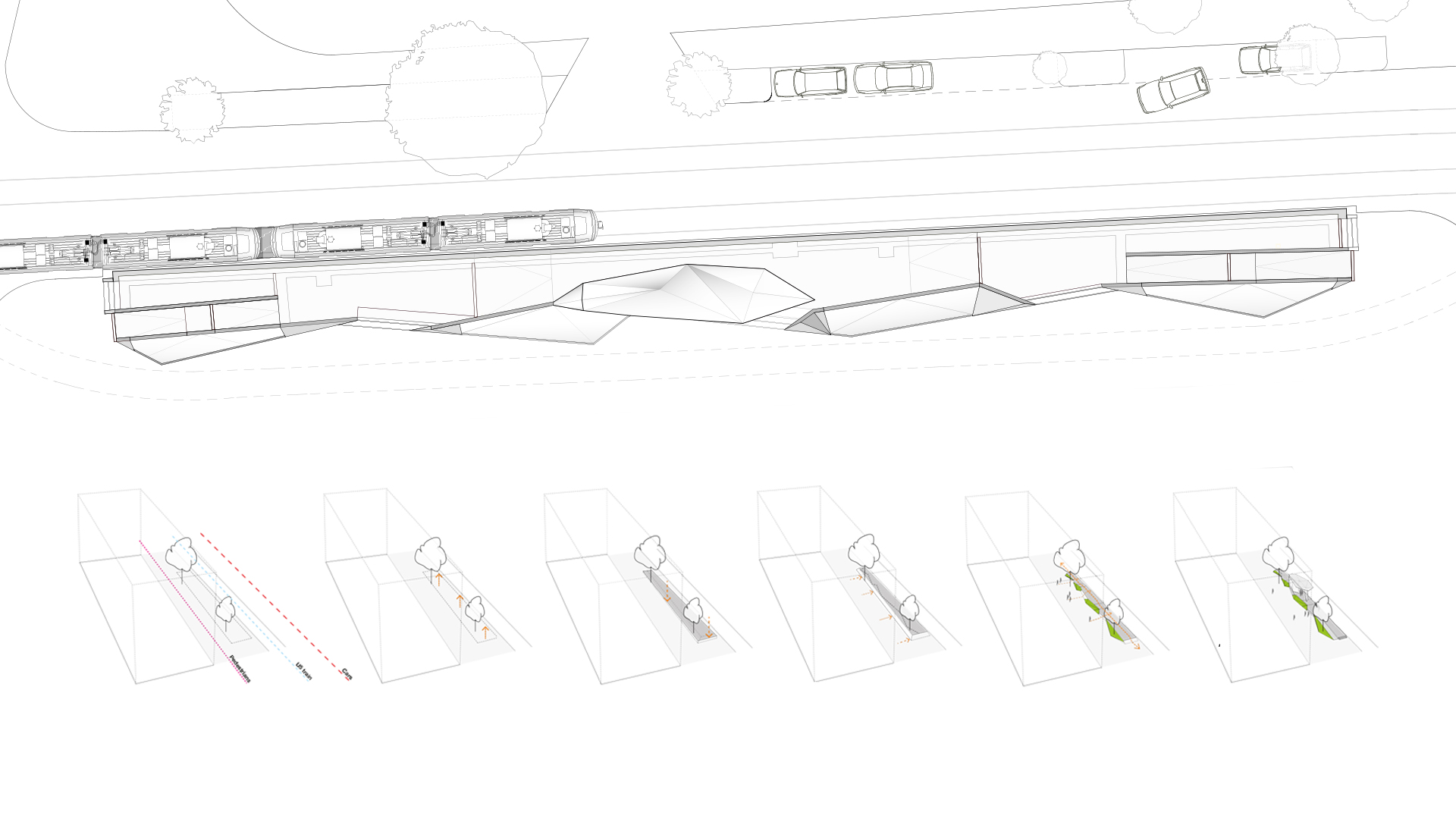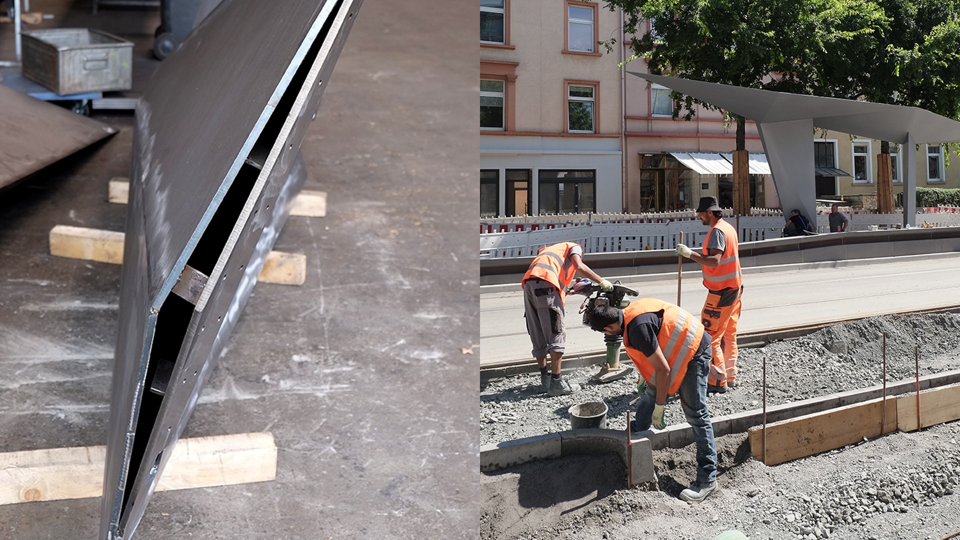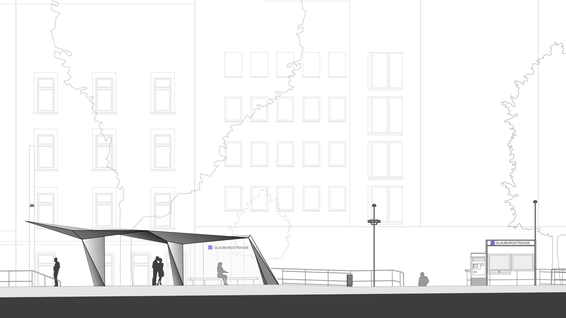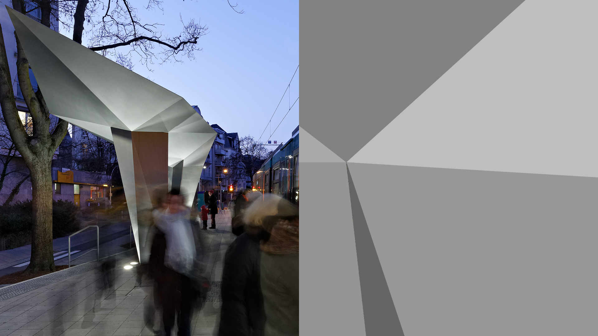 Die Wartehalle wird zu einer begehbaren Skulptur, zu einem Stadtmöbel, dass sich nicht sofort als Haltestelle zu erkennen gibt und somit die Neugierde zum selber erkunden anregt. Die skulpturale Wartehalle besteht aus präzisen, nahtlos verschweißten, scharfkantigen Stahlplatten, welche gefaltet an japanisches Origami erinnern.