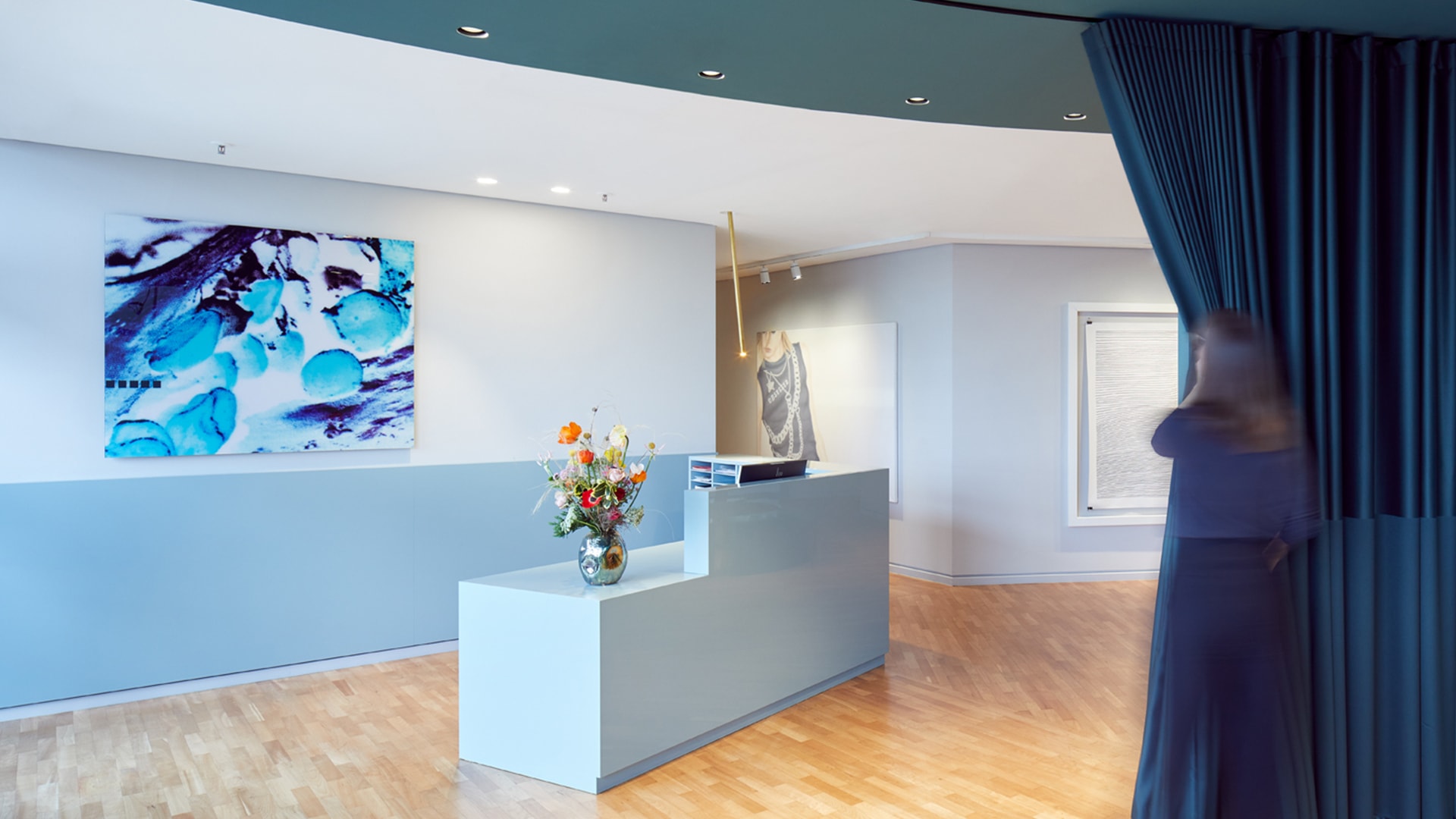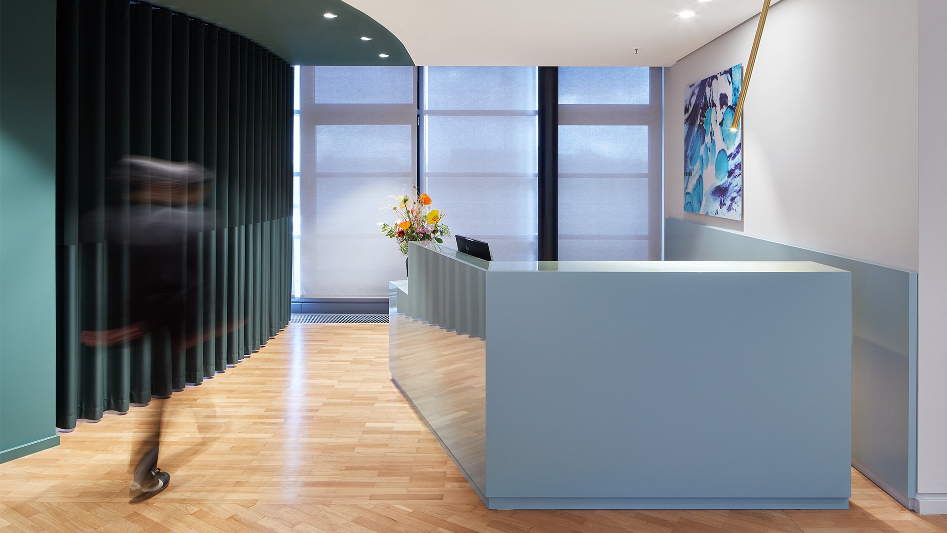 Die Bürofläche hat durch einige Veränderungen der Raumaufteilungen insgesamt optisch an Weite gewonnen. Der neue Tresen befindet sich nun im hinteren Teil des Empfangsbereich und gliedert sich auch farblich in das Gesamtgeschehen ein, was dem Raum zusätzliche Tiefe verleiht. Anstelle des ehemaligen Tresens steht nun ein eindrucksvolles mehrfarbiges Kunst-Objekt, welches gleichzeitig als Statement-Möbel auch zum Sitzen einlädt. Auch die verglaste Trennwand, die den Warte- und Empfangsbereich vom Eingang abgetrennt hat, ist einer Textiltrennwand in Form eines raumhohen Vorhangs gewichen. Der Vorteil gegenüber der vorigen Trennwand ist nicht nur die optische Öffnung des Raumes, sondern die Möglichkeit, den Wartebereich trotzdem noch für einen diskreteren Empfang flexibel durch Schließen des Vorhangs umzufunktionieren, ohne den normalen Arbeitsablauf zu stören.