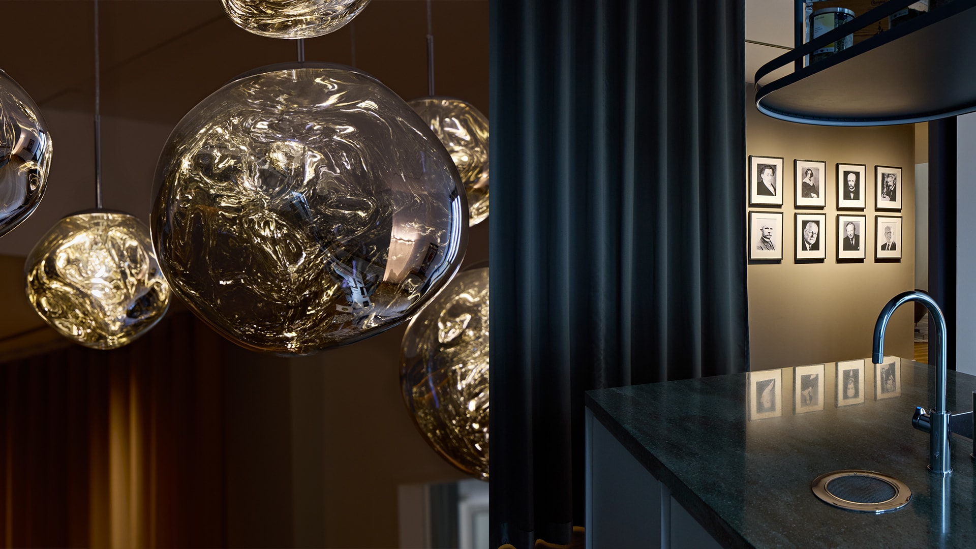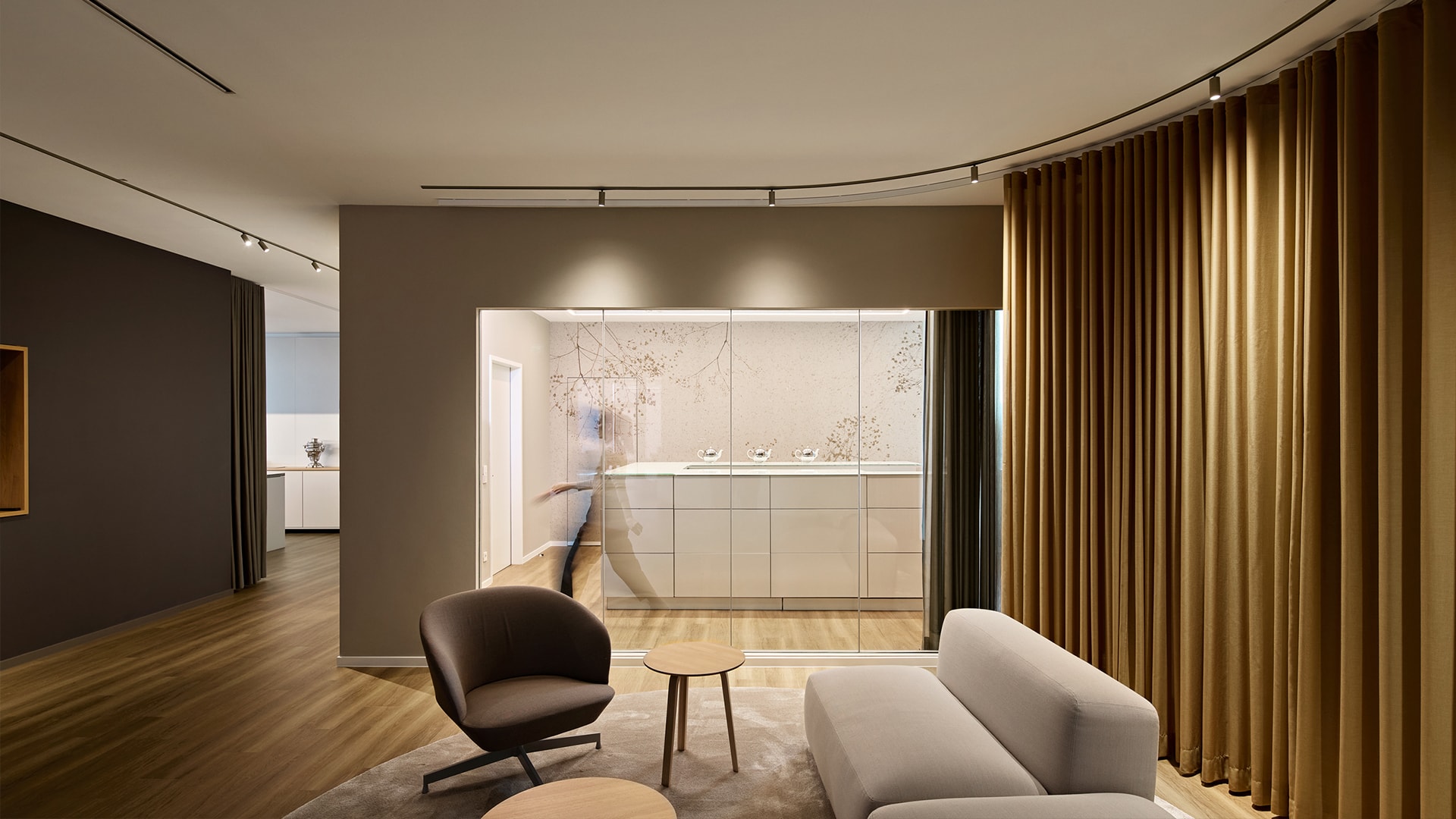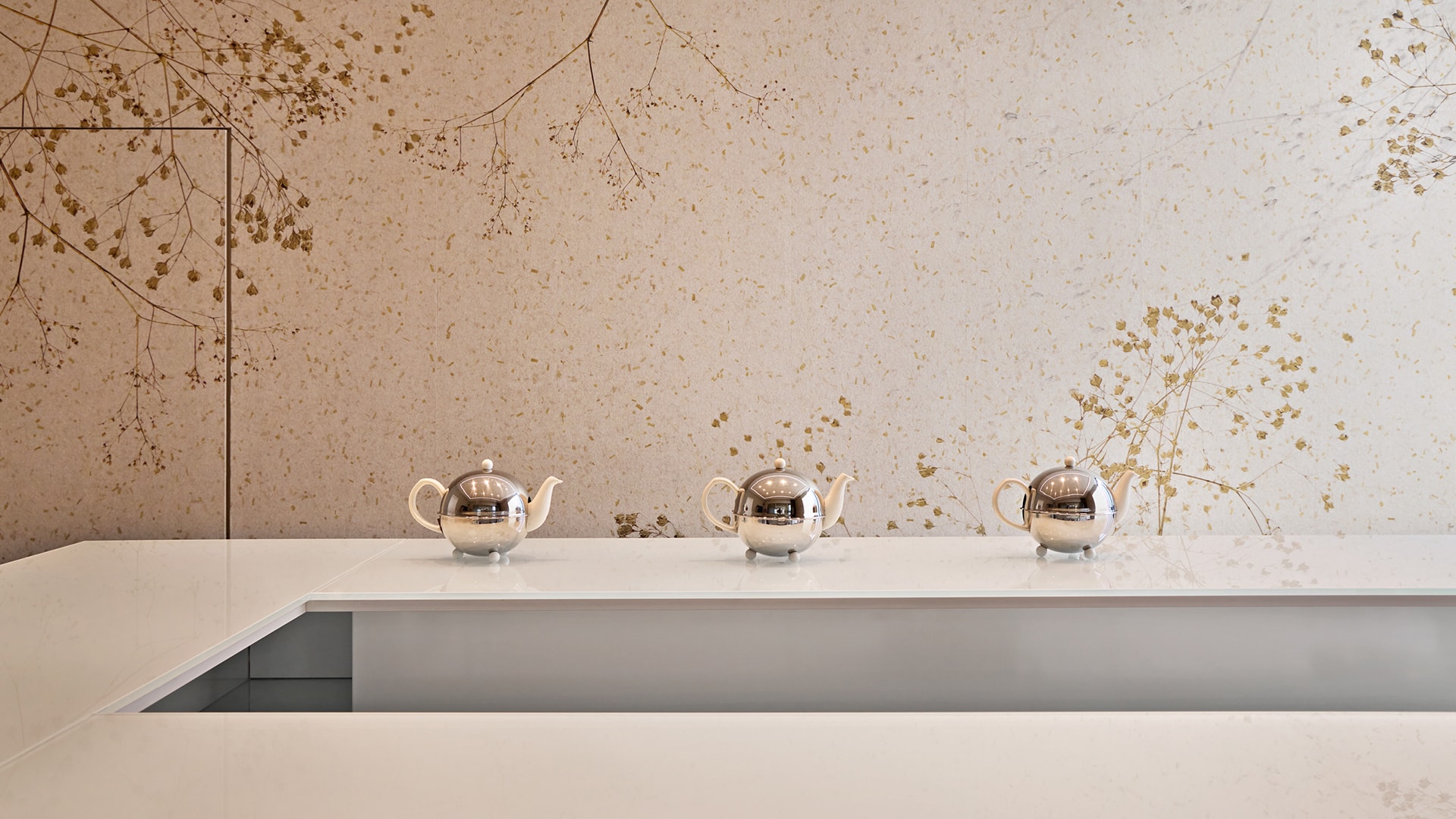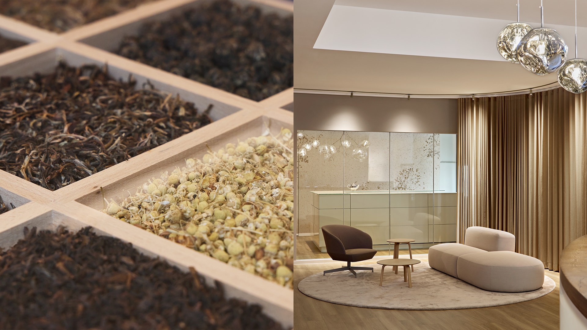 Die Hochwertigkeit der Tees und ihre feinen Aromen spiegeln sich ebenso in den dezenten Farben der Materialien und Möbel wider. Runde Formen erinnern an die zarten Bewegungen der Teezeremonie, während die eleganten, fließenden Leuchten an herabfallende Wassertropfen erinnern.