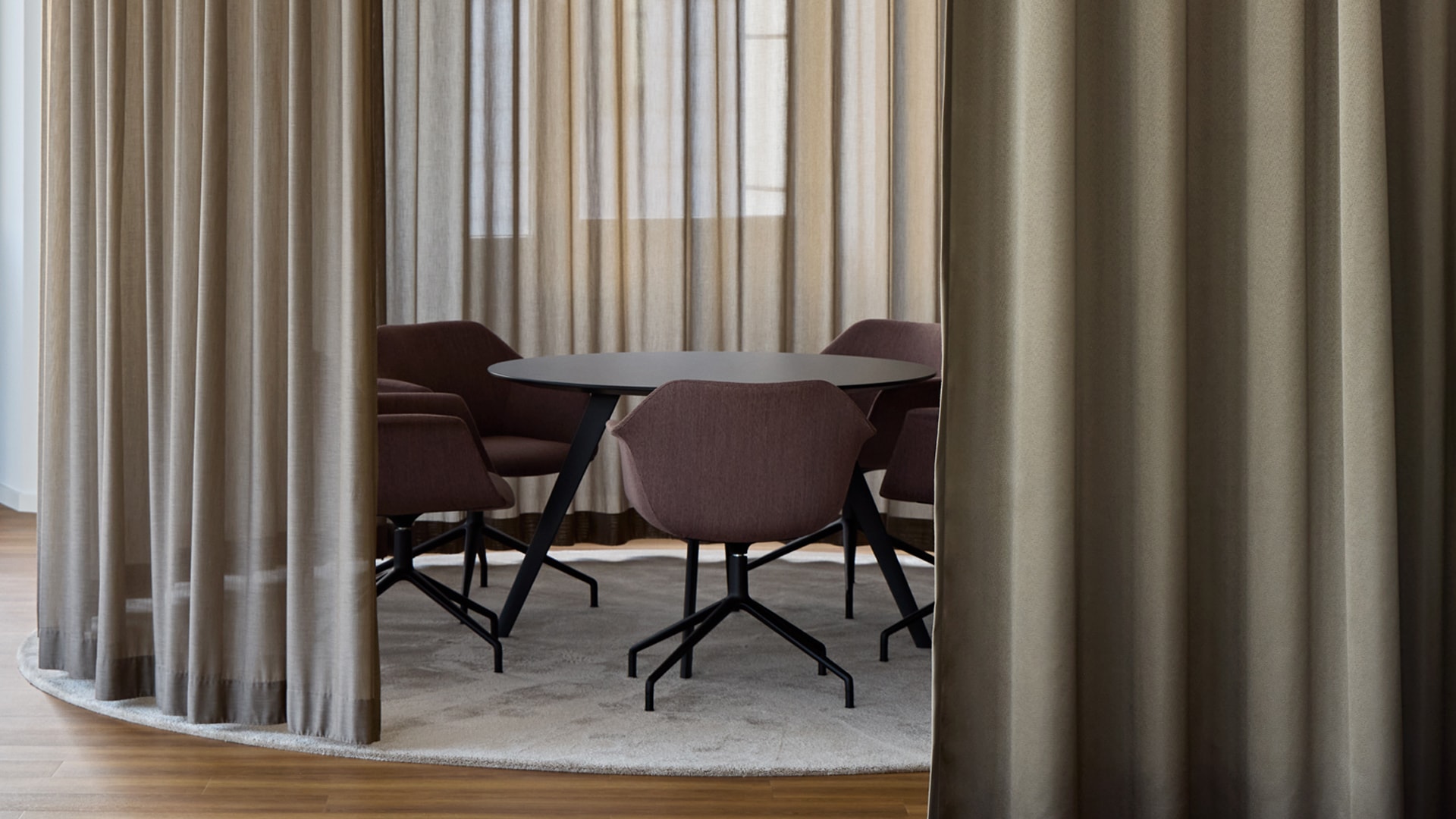 Mit Blick auf den Main erstreckt sich die offene Bürofläche, die am Ende der Einzelarbeitsplätze in eine großzügige Lounge mit Panoramablick übergeht. Durch textile Elemente lässt sich der Raum in die unterschiedlichsten Meeting-Möglichkeiten unterteilen, was sie zu einem vielseitig nutzbaren Ort für Kommunikation im Team macht.