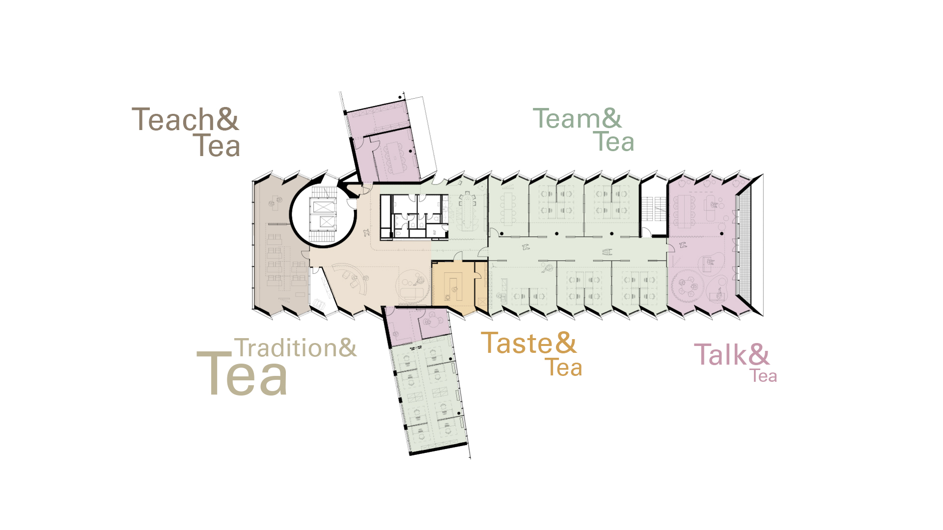 Die motivische Wandgestaltung des Tea-Tasting Raumes entfaltet sich wie zarte Teeblätter und durchdringt dank großflächiger Verglasung die Atmosphäre mit zurückhaltender Eleganz. Laufende Tastings und Schulungen setzen den Fokus auf die erlebbare Welt der Kunst des Tees. Veränderbare Lichtsituationen und Farben inszenieren den direkten Kontakt mit dem Produkt auf anregende Art und Weise. Das Produkt wird im Teelabor nicht nur ausgestellt, sondern in all seinen Facetten sinnlich erfahrbar gemacht.