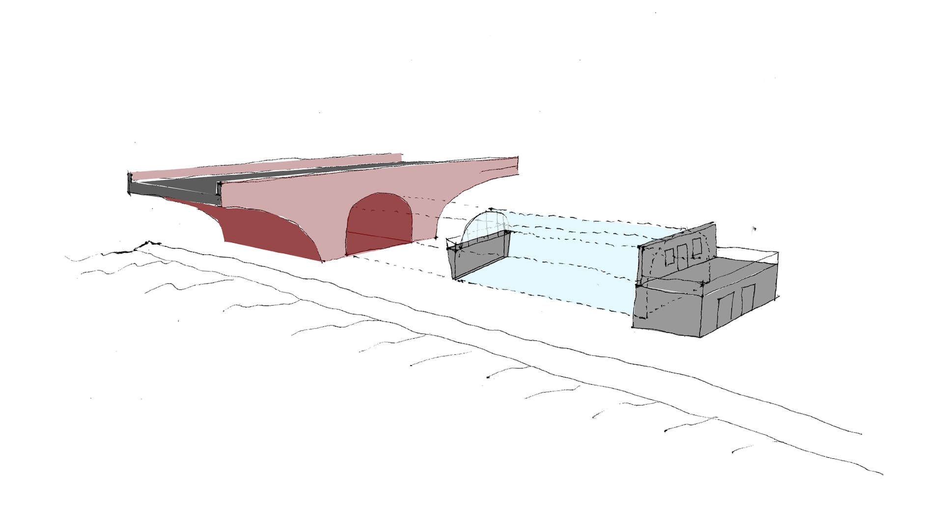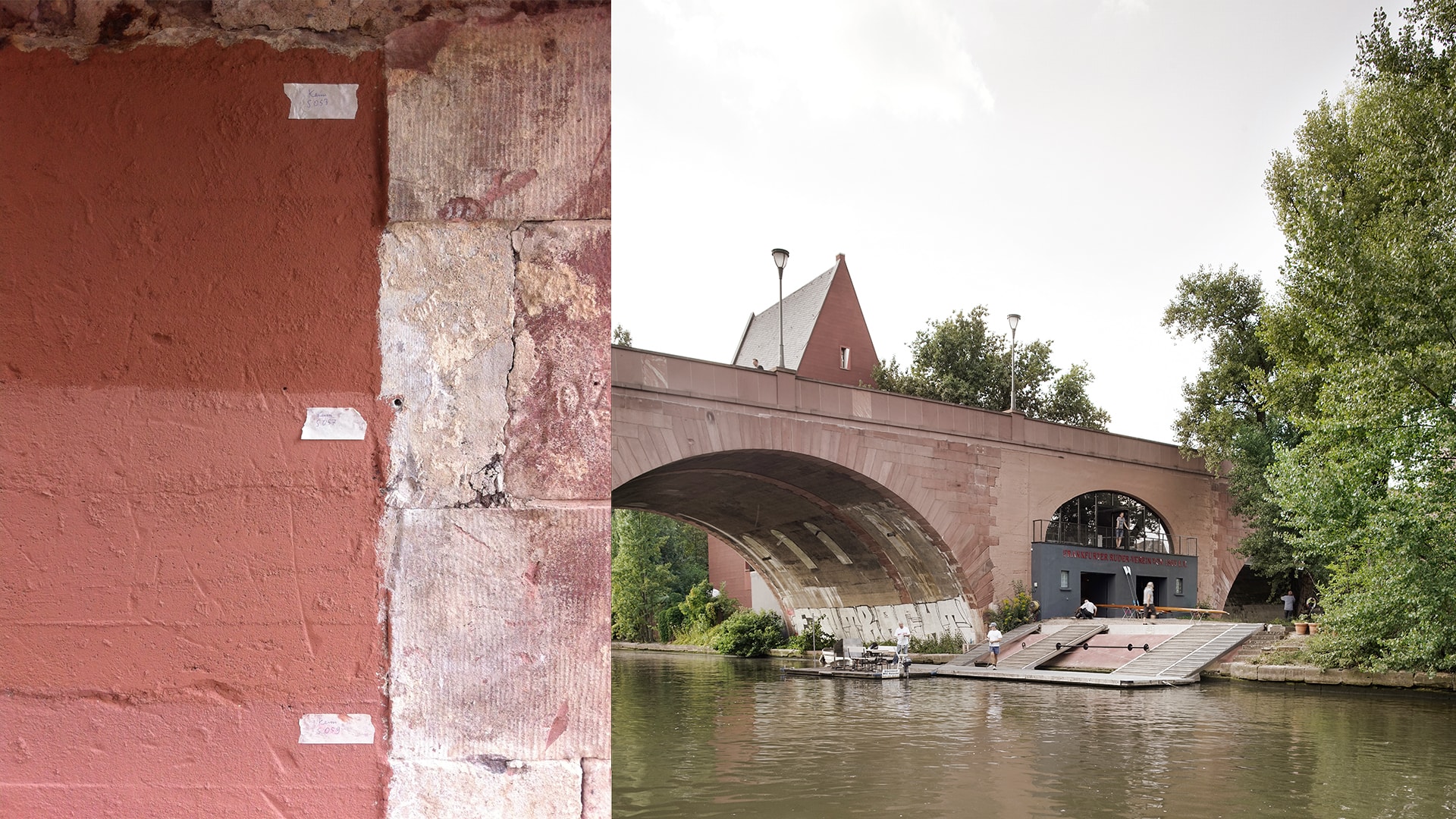 Unser Entwurfskonzept begreift das zweigeschossige Bootshaus als einen Baukörper, der durch den Brückenbogen durchgesteckt ist, wodurch ein aktiver Bezug zum Stadtbild hergestellt wird. Alle Bauteile wurden durch ein einheitliches Farbkonzept abgestimmt, um sie an einem stadtbildprägenden Ort wie der Maininsel und zusammen mit der Alten Brücke wieder zu einem stimmigen Ensemble zusammenwachsen zu lassen.