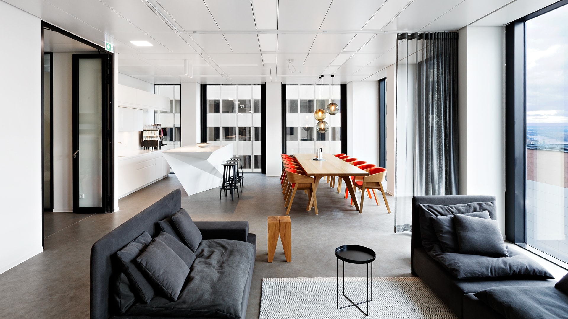 Wir haben den Alltag der Mitarbeiter neu gestaltet und kleine Teeküchen durch einen großen Coffee Point ersetzt. Dieser einzigartige Raum, der sich in einer Ecklage mit Skylinepanorama befindet, bietet mehr als nur eine Kaffeemaschine und Mikrowelle. Er ist in drei Zonen unterteilt und dient den Mitarbeitern als Rückzugsort, um Energie zu tanken und neue Ideen zu entwickeln. Ein eigens von uns entwickelter Stand-In-Tresen lädt zu einem schnellen Kaffee zwischendurch ein, ein langer Holztisch schafft Raum für gemeinsame Lunches, und eine Lounge, die durch Vorhänge abtrennbar ist, ermöglicht entspannte Gespräche. Eine kompakte Küche ist geschickt durch ein eingestelltes Möbel optisch und akustisch abgetrennt, sodass die Atmosphäre harmonisch und ruhig bleibt.