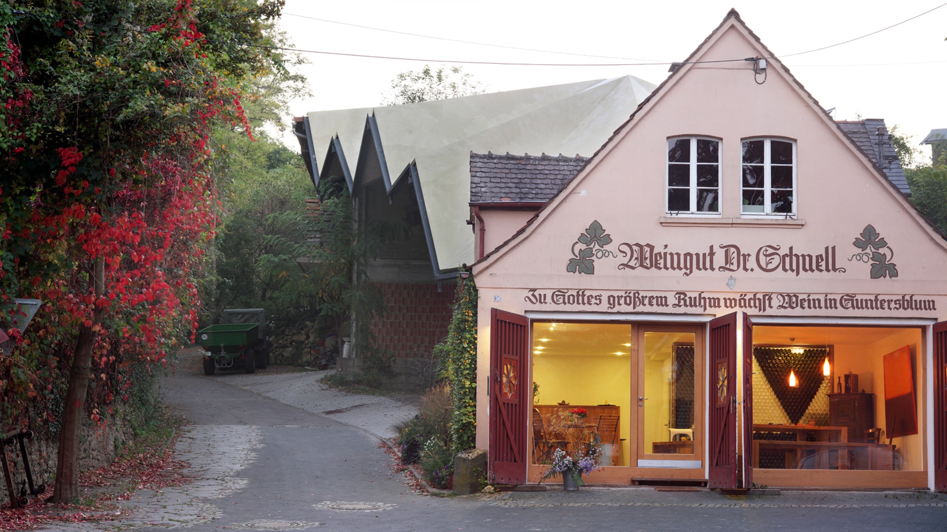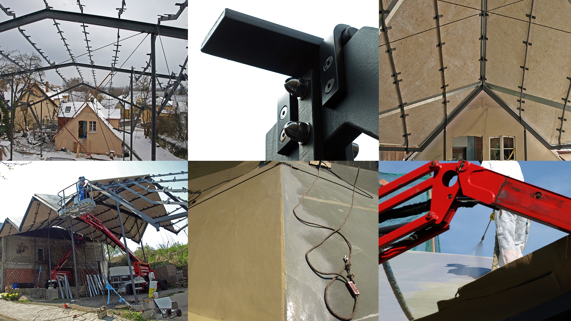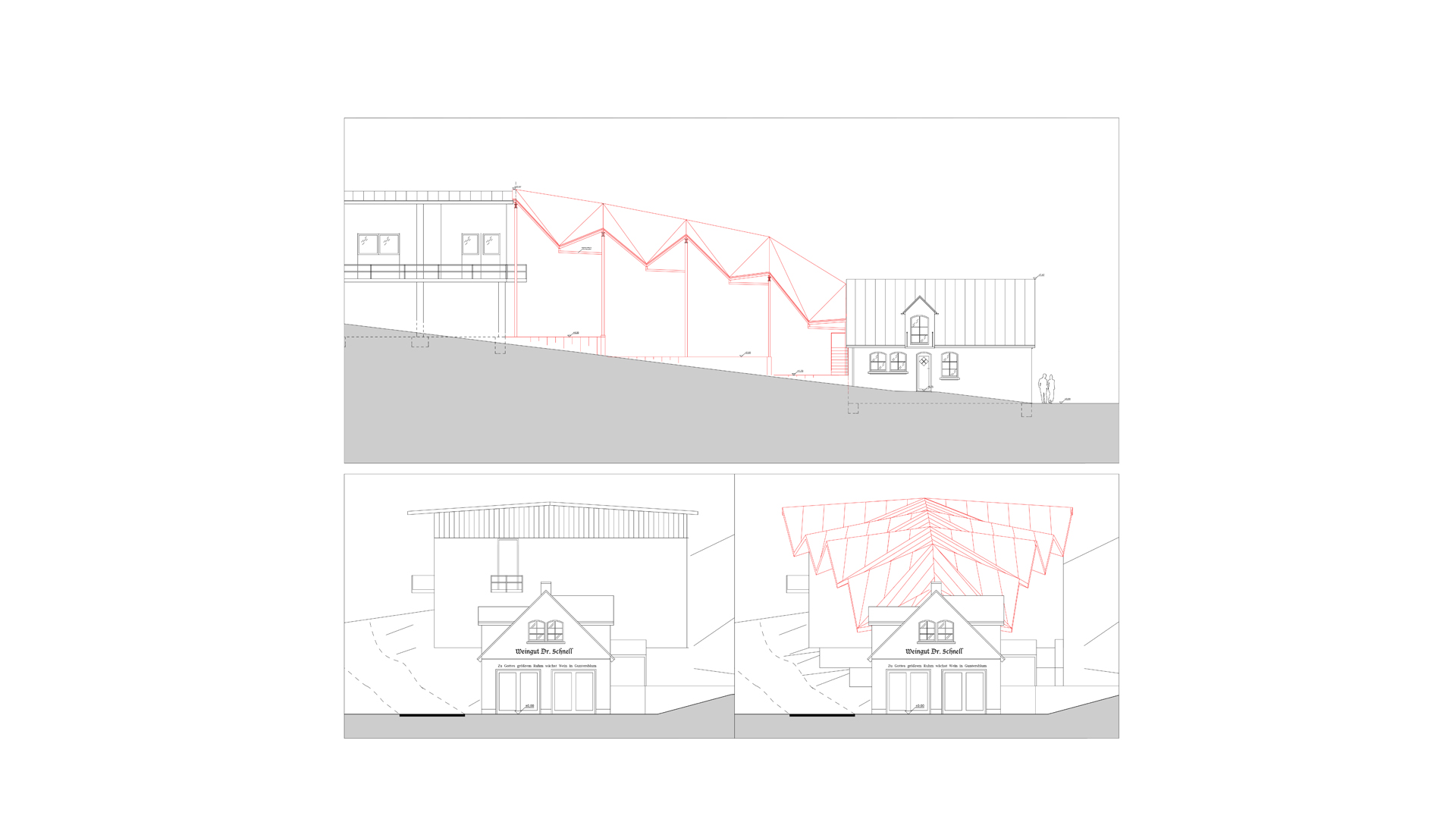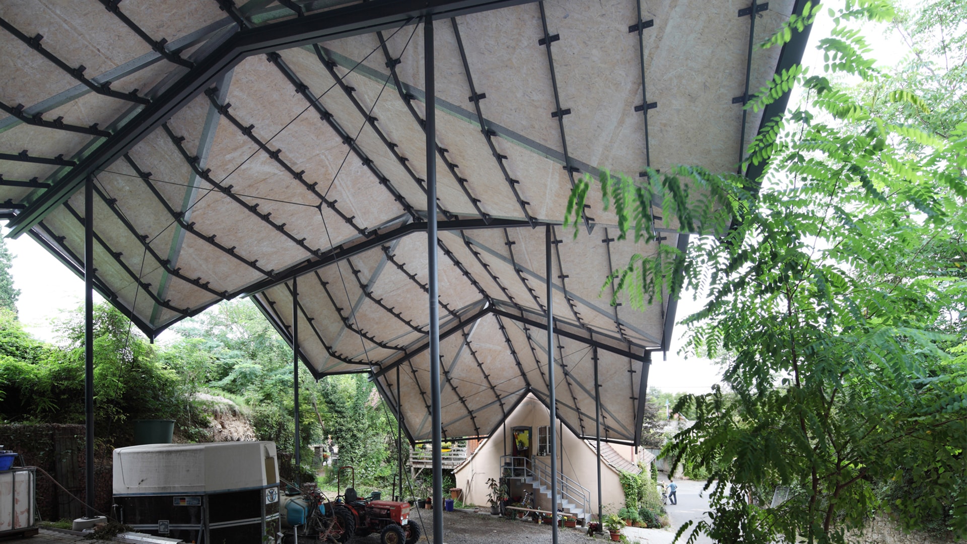 Eingebettet in eine Landschaft aus Weinbergen und Satteldächern, liegt im rheinland-pfälzischen Guntersblum das Weingut Schnell. Um in der kleinteiligen Struktur des Winzerdorfes als Gesamtensemble erlebbar zu werden, schließt eine neue Überdachung die bauliche Lücke zwischen bestehendem Gerätehaus und Wohngebäude des Winzers. Die Kunst lag darin, die komplexe Geometrie unseres Entwurfsansatzes konstruktiv so einfach wie möglich darzustellen, so dass der Bauherr selber an der Umsetzung der Montage des Daches arbeiten konnte. Ziel war es, die filigrane Stahlkonstruktion nach dem Prinzip eines Selbstbaukastens zu entwickeln.