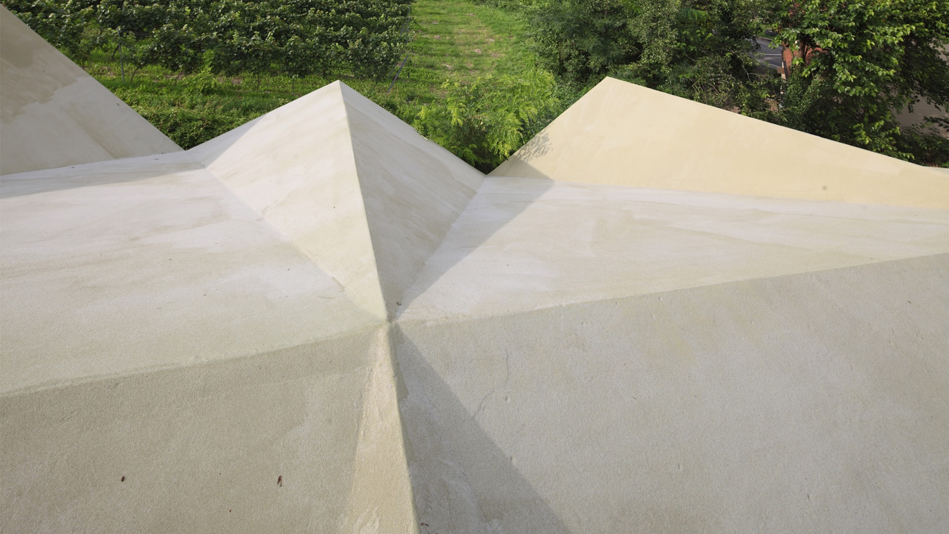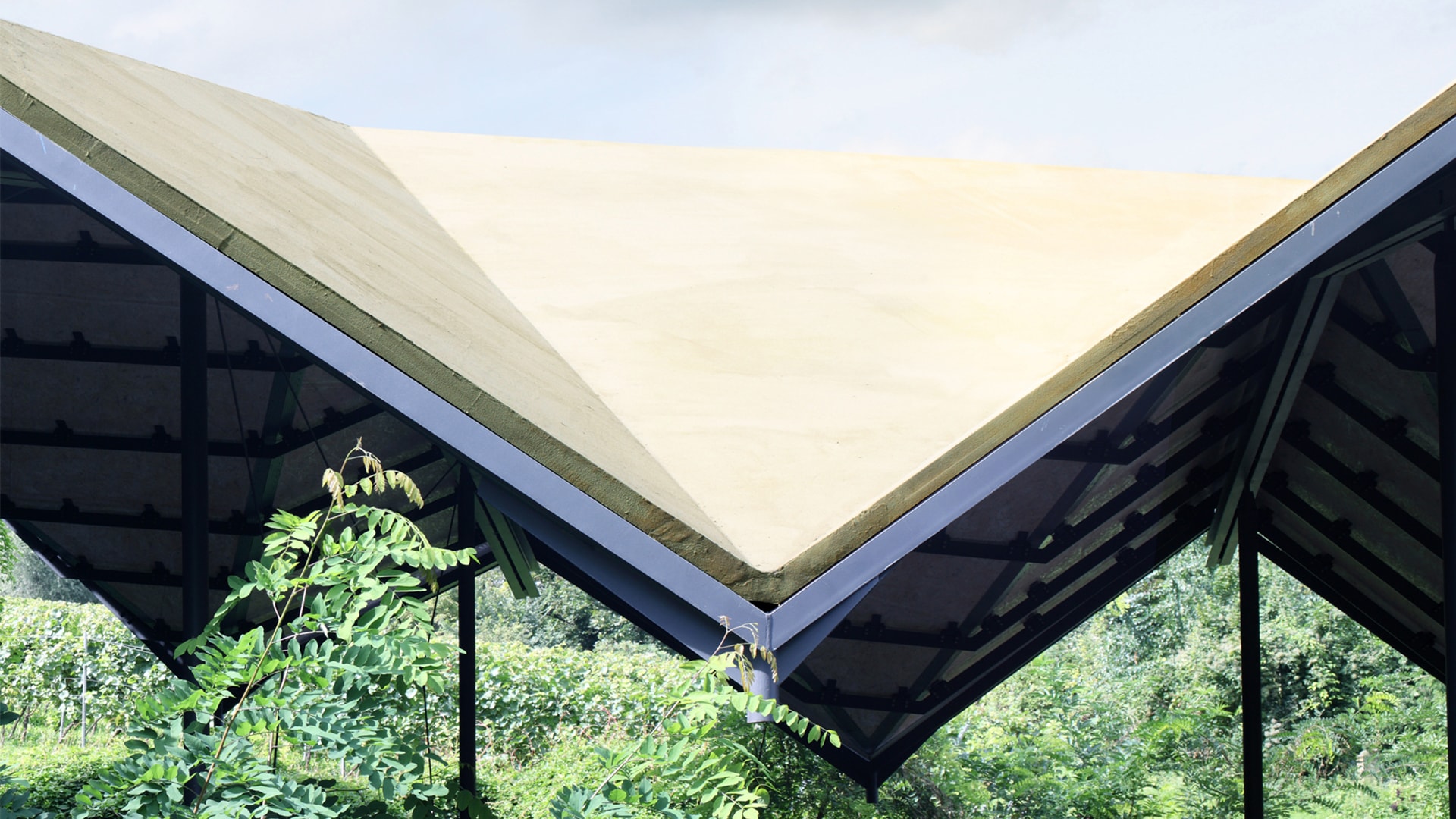 Aufliegend auf einer äußerst filigranen Stahlkonstruktion, besteht die Dacheindeckung aus ungedämmten und mittels Flüssigkunststoff abgedichteten Holzplatten. Das Spritzelastomer, fugenlos auf die gesamte Dachfläche aufgebracht, schafft eine homogene, unaufgeregte Oberfläche. Der Farbton, ein Grünbeige, wiederum schafft die Verbindung zu den umgebenden Weinreben, sodass sich die skulpturale Dachkonstruktion harmonisch in ihr Umfeld einfügt, denn - „Zu Gottes größerem Ruhm wächst Wein in Guntersblum“.