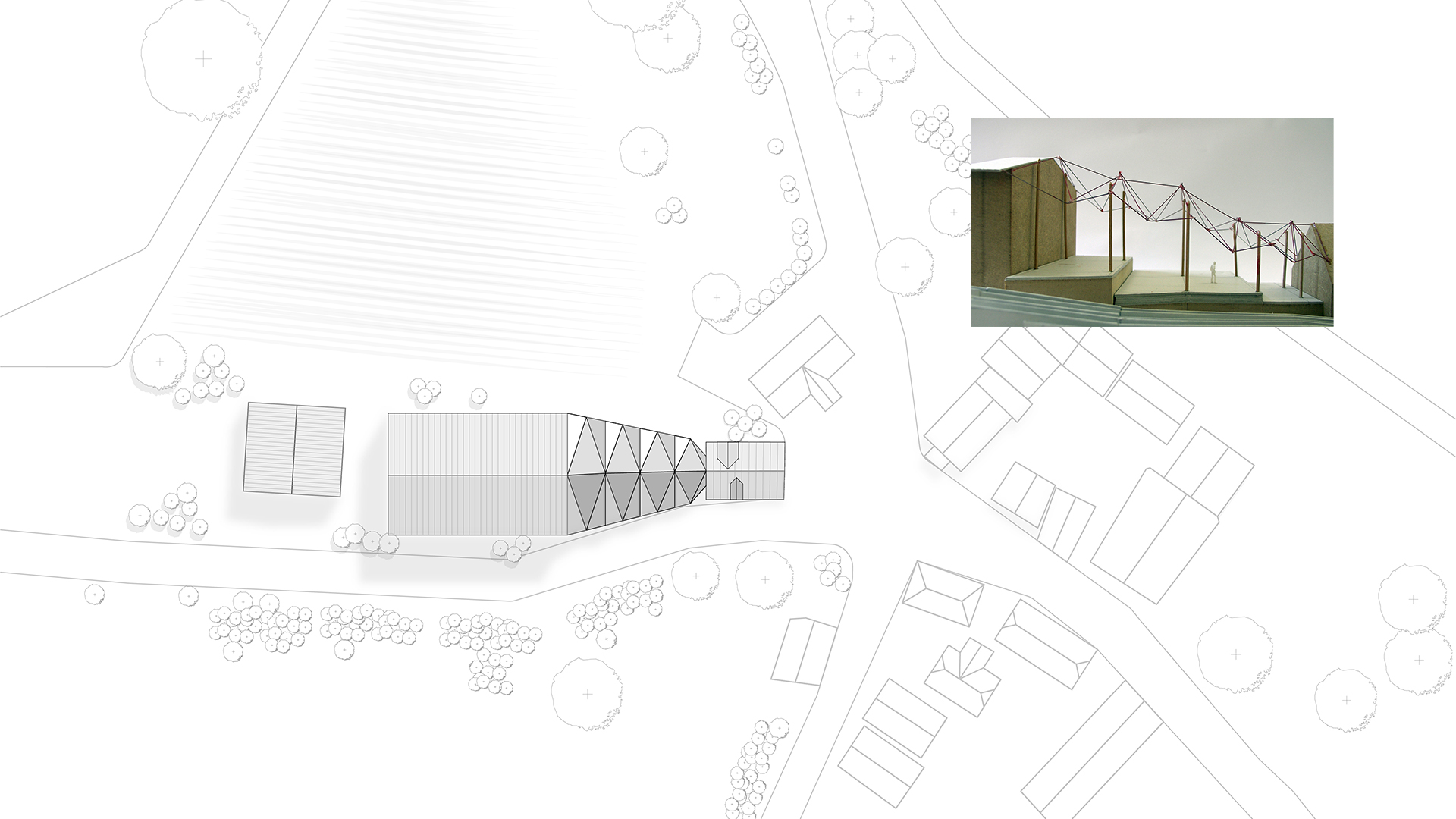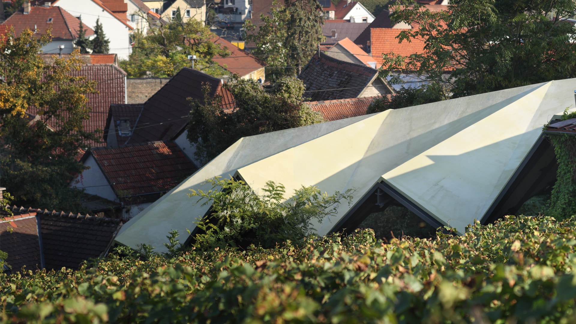 Die gefaltete Geometrie des Daches vermittelt zwischen den Höhen der am Hang gelegenen Bestandsgebäude. Zugleich behält die Dachlandschaft als dreidimensionales Faltwerk die Kleinmaßstäblichkeit der dörflichen Dachstrukturen bei, indem sich die große Fläche in eine Abfolge von „kleinen Satteldächern“ unterschiedlicher Neigung auflöst.