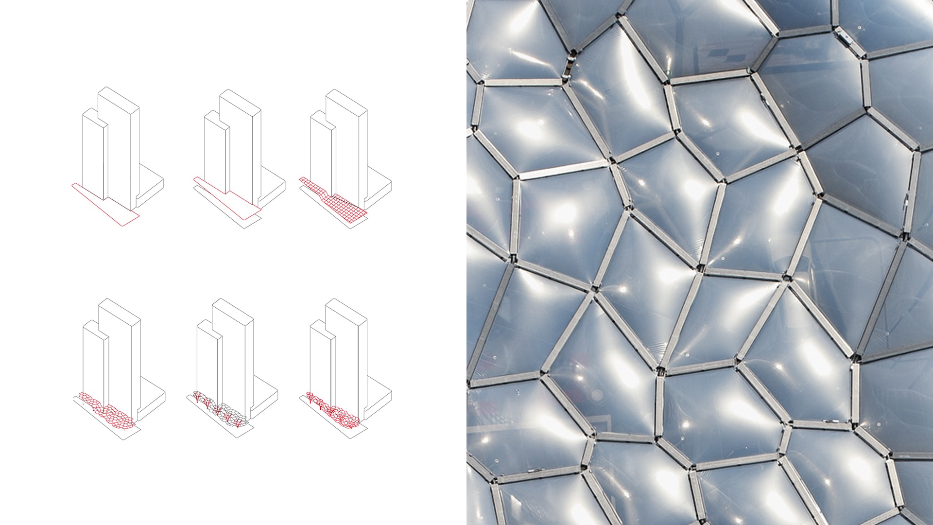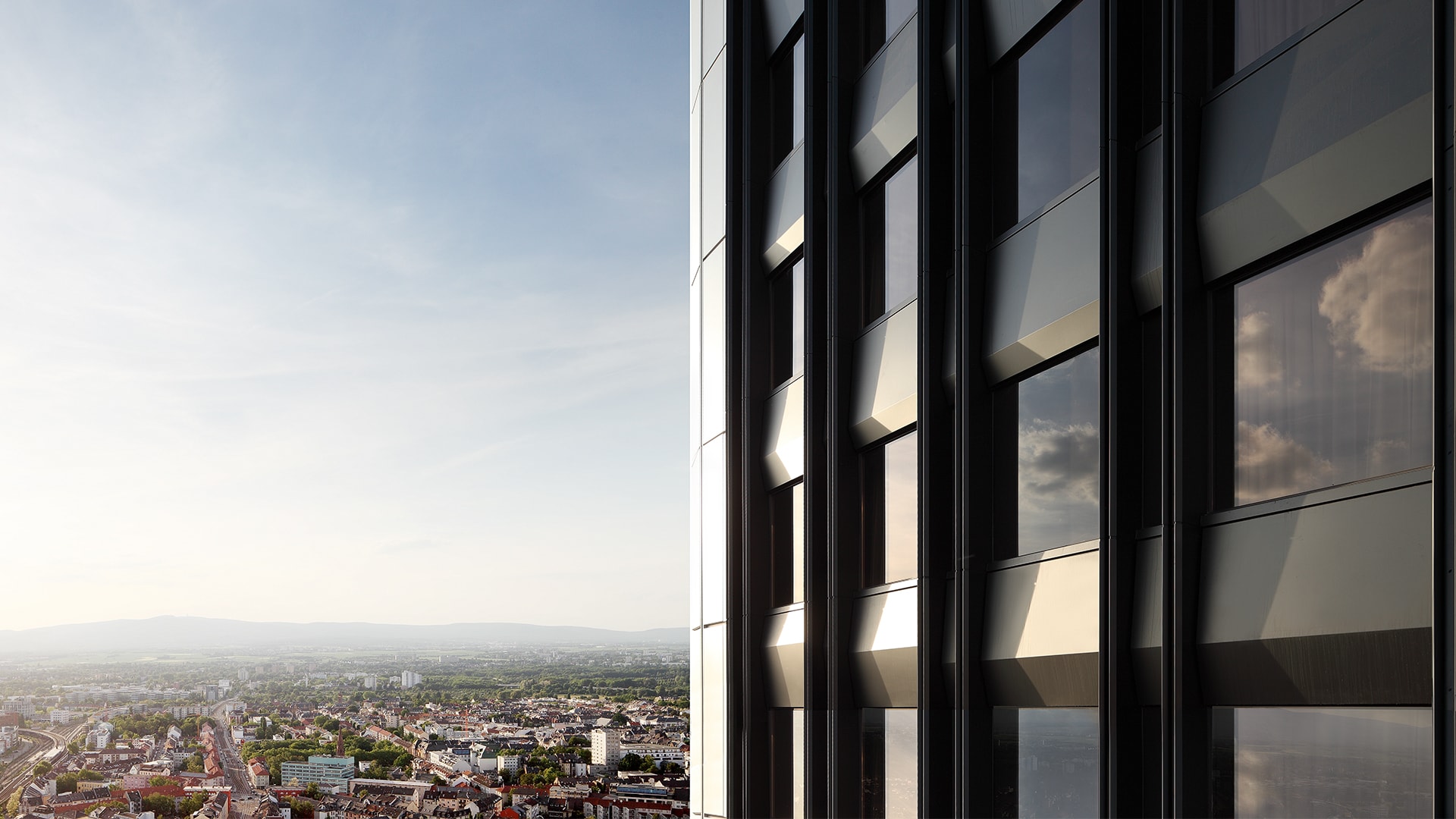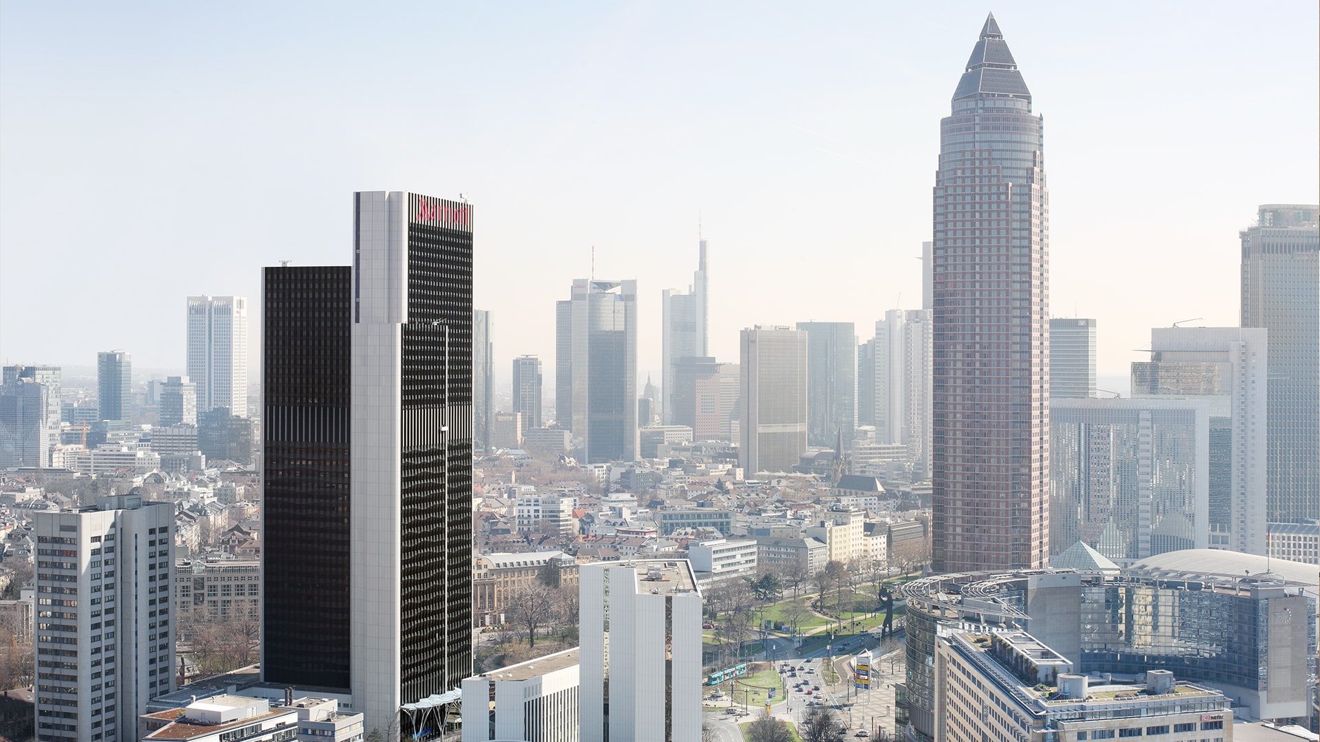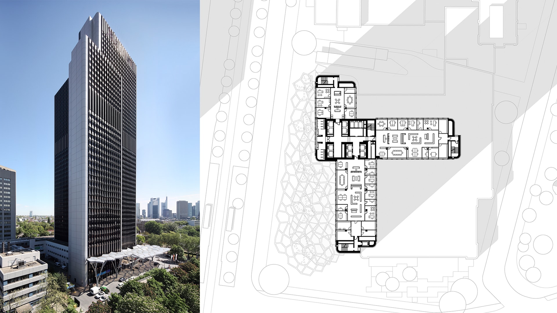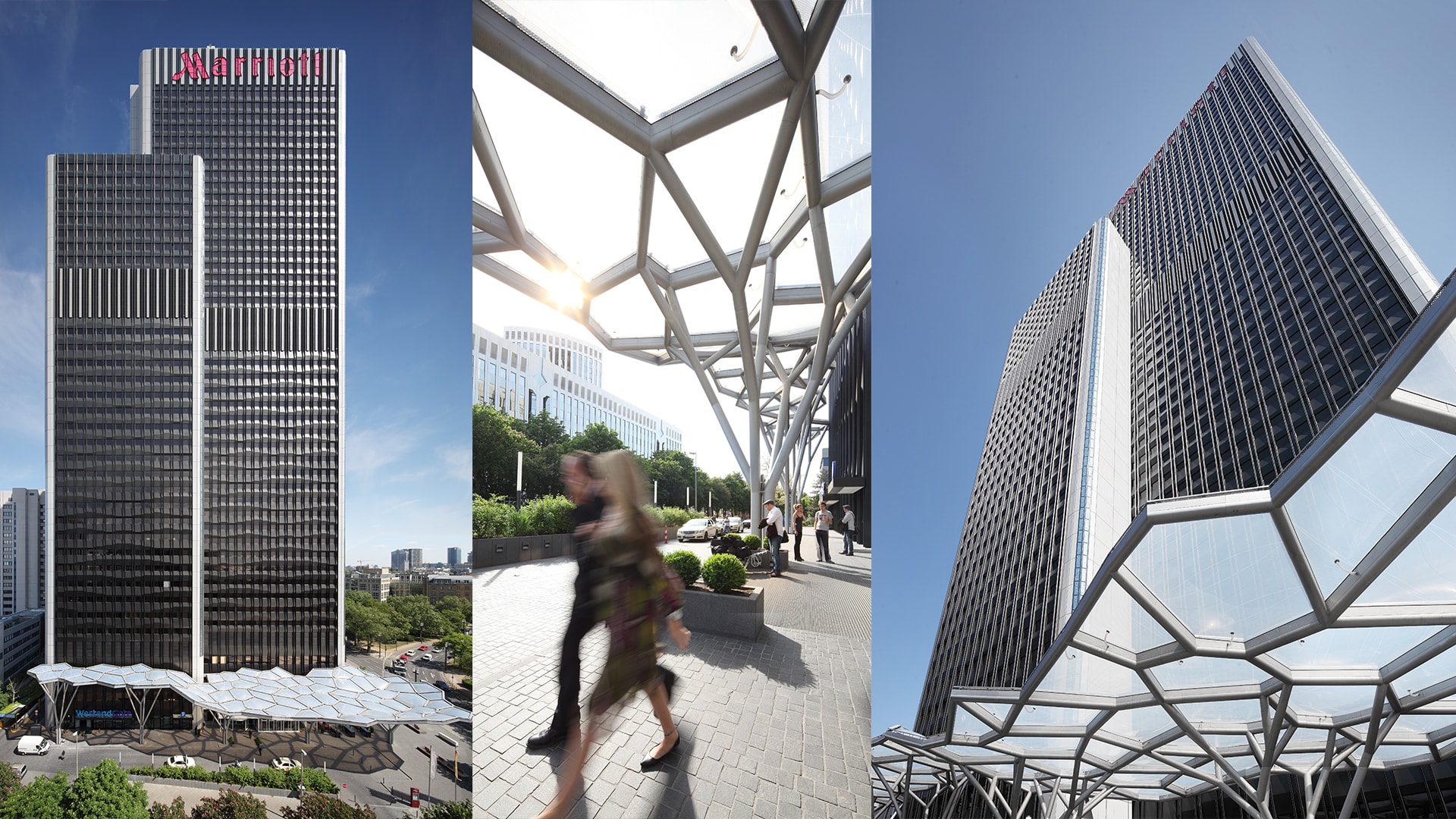 Das Bestandsgebäude, eigentlich ein Ensemble aus drei versetzten, unterschiedlich hohen Hochhausscheiben, spricht die Architektursprache der Siebzigerjahre. Mit einer Mietfläche von 25.000 Quadratmetern, haben wir die zukunftsfähige Büro- und Hotelhochhausimmobilie ästhetisch und funktional wieder attraktiv gemacht. Sichtbar an Frankfurts westlicher Hauptverkehrsader, zwischen Messegelände und Westendviertel gelegen, wurde die neue Adressbildung zunächst durch die Umgestaltung der Eingangssituation vollzogen. Der Rückbau vieler kleinteiliger Elemente in der Sockelzone und die Verlegung der Tiefgarageneinfahrt ermöglichte es, dass sich das Gebäude und sein Vorplatz wieder gleichwertig in der städtebaulichen Situation behaupten können.