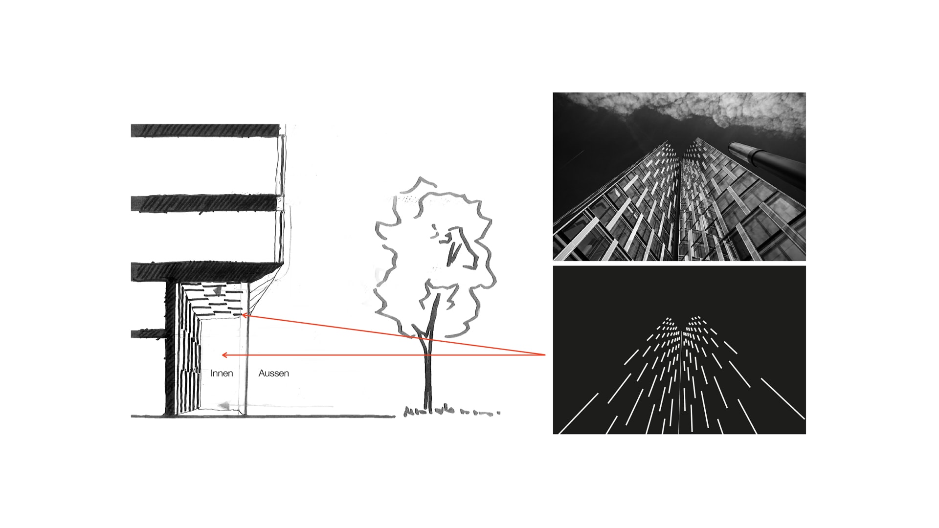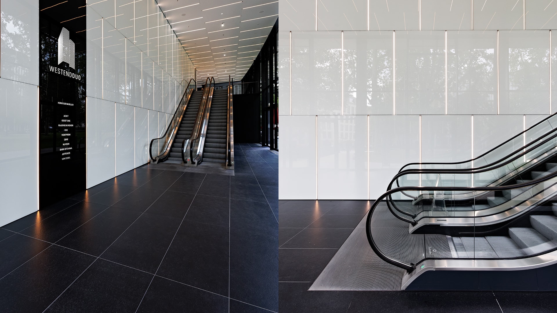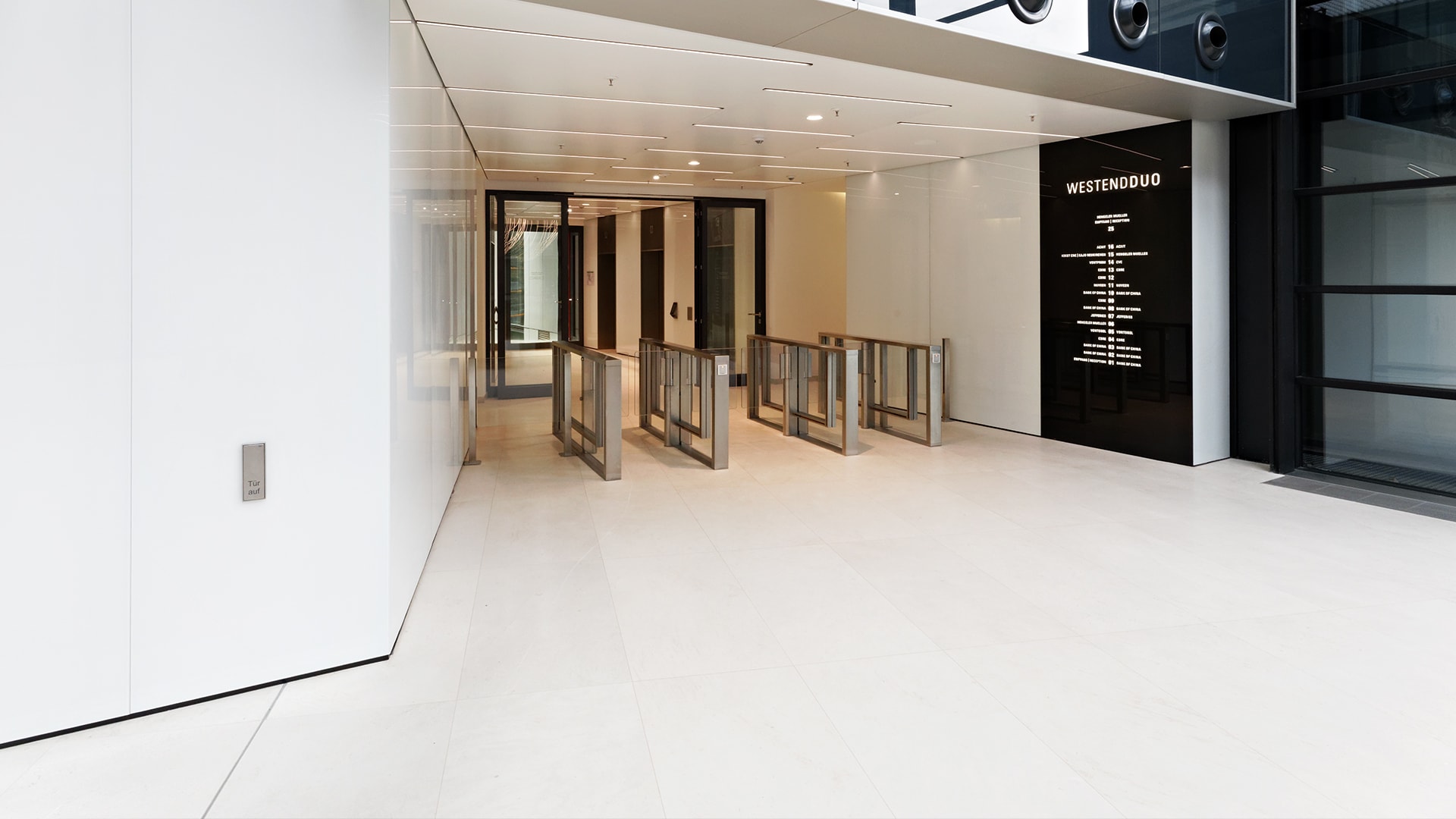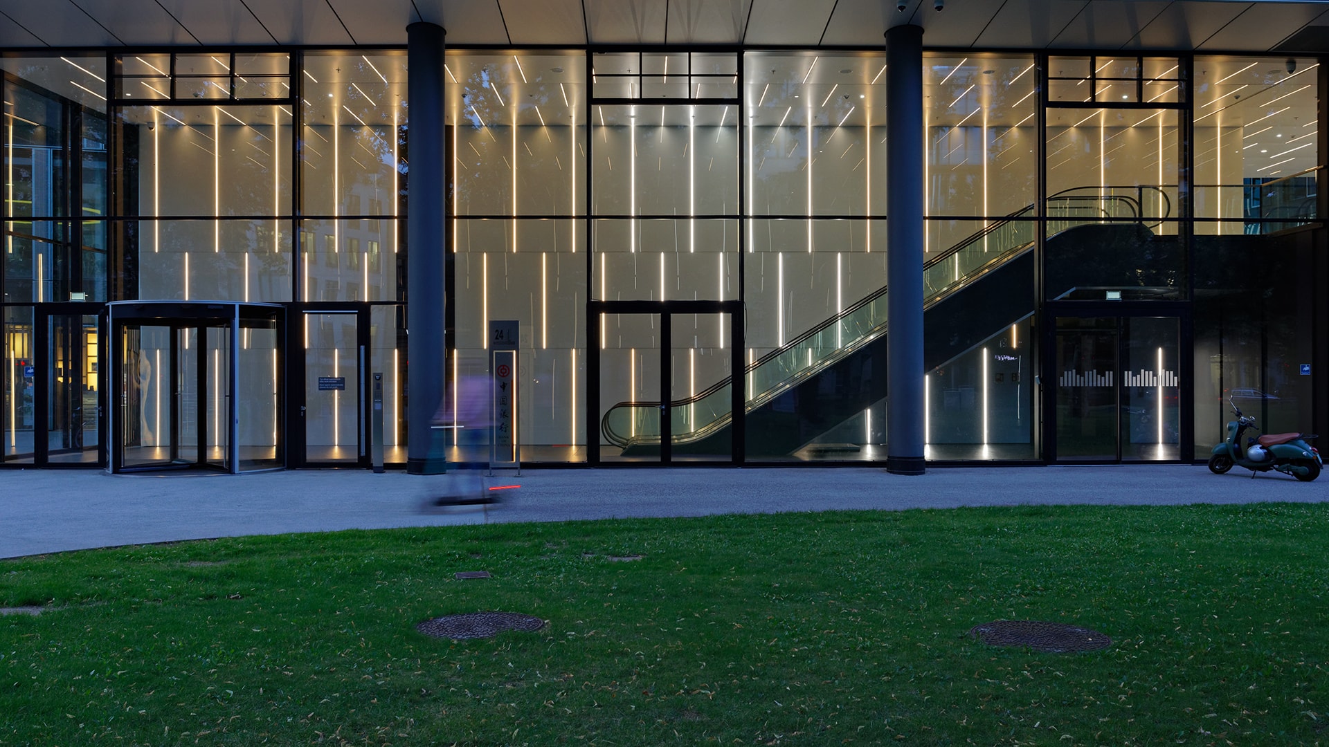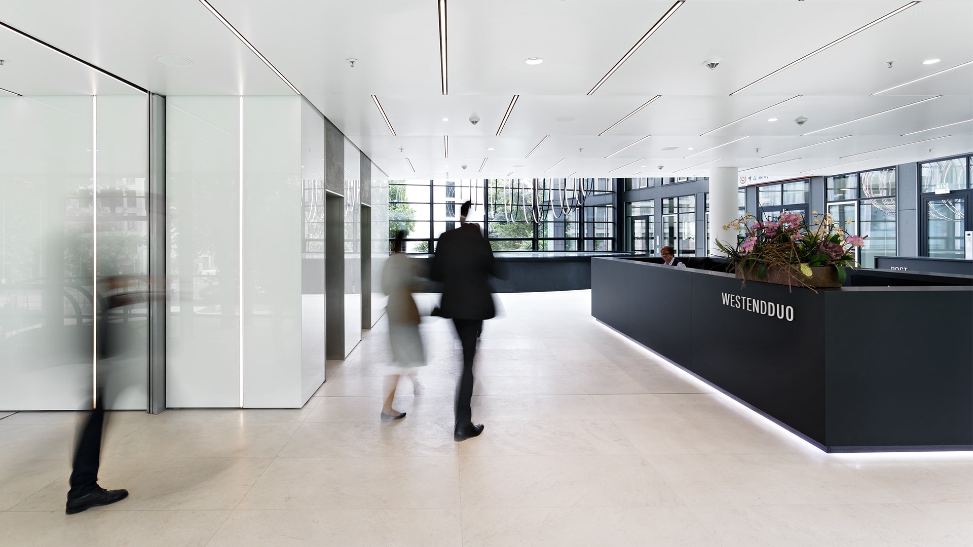 Ein Design Enhancement als Raummetarmorphose. Mit diesem Leitmotiv haben wir für das WestendDuo ein gestalterisches Wechselspiel zwischen Innen- und Außenraum entwickelt. Wir greifen die lineare Struktur der Außenfassade auf und setzen sie mit strukturgebenden Linien als Lichtkonzept im Inneren fort. Dies verleiht nicht nur der Eingangshalle eine besondere Atmosphäre, sondern bereichert auch den öffentlichen Raum. Die animierten Lichtlinien funktionieren außerdem als abstraktes Wegeleitsystem – sie führen die Besucher changierend durch den Transit-Bereich im Erdgeschoss hinauf in den ersten Stock.