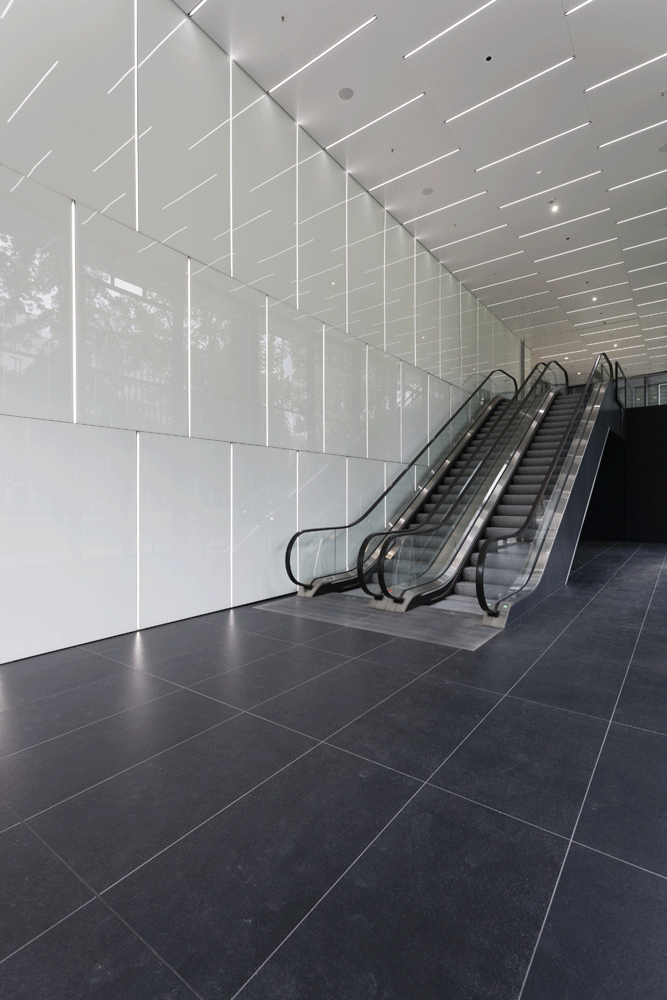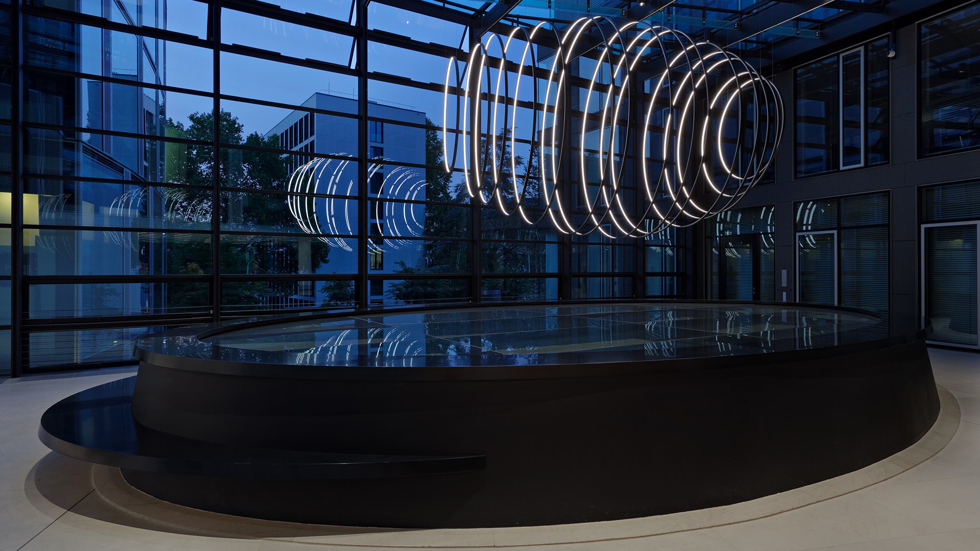 Ein besonderes Highlight der Eingangssituation ist das individuell steuerbare Lichtkonzept, das eine dynamische und abwechslungsreiche Gestaltung des Raums erlaubt. Die Leuchten fügen sich dezent in die Decken und Wände ein. Am Morgen sind die Lichtfarben warm gehalten, was aus Sicht der Forschung dem Biorhythmus entspricht. Die Lichtfarbe wächst vormittags stufenlos zu einem hellen Licht mit einem höheren Blauanteil, was natürliche Lichtquellen imitiert. Zum Abend hin wechselt die Stimmung zu einer warmen Lichtfarbe mit niedrigerer Beleuchtungsstärke.